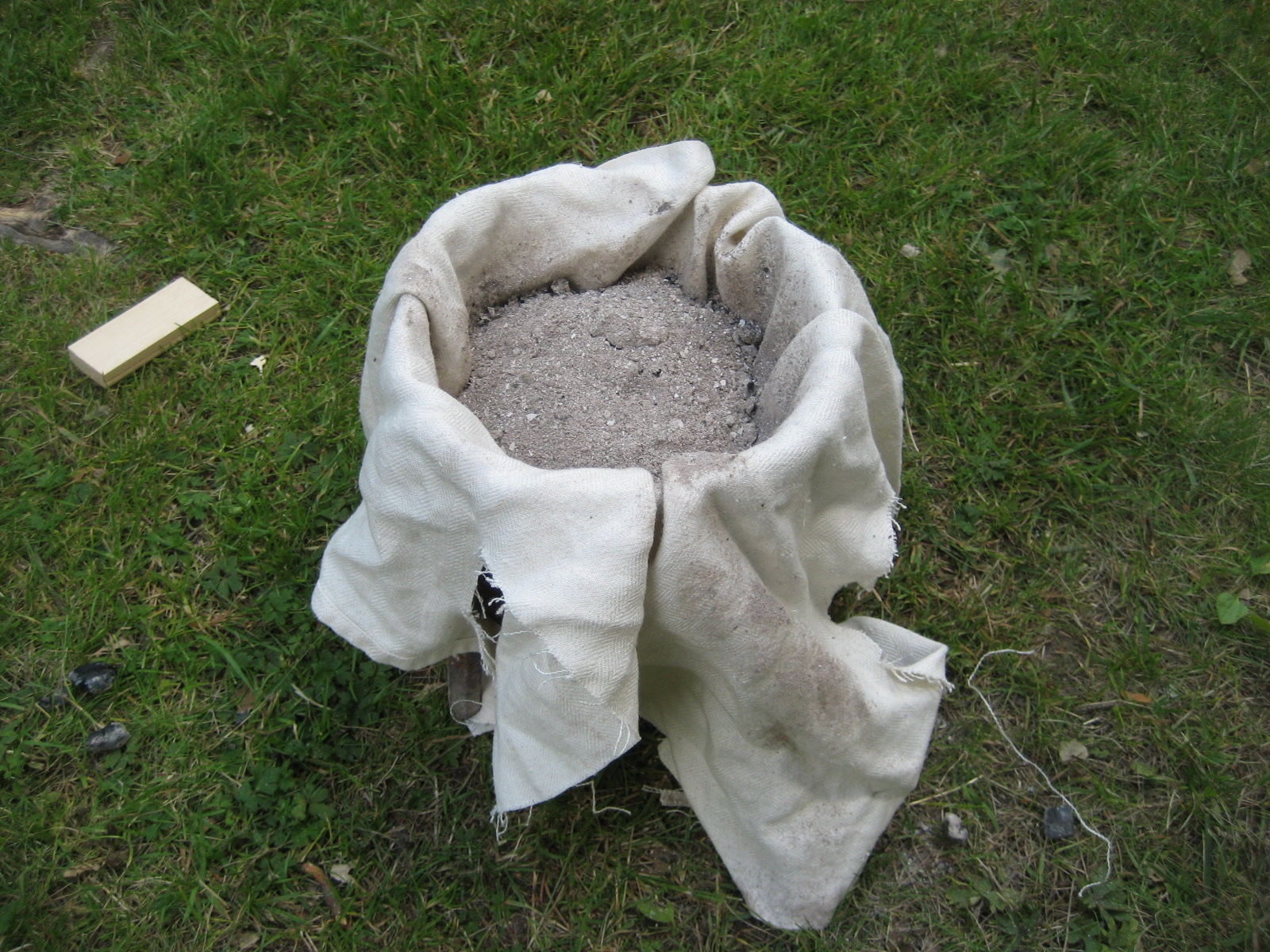 Steg1. Lut. Vi började med att tillverka en ganska stark lutlösning. Bretschers sätt var mycket smart och enkelt. Vi fodrade en mässingskittel med lintyg och höftade i en dryg liter björkaska.