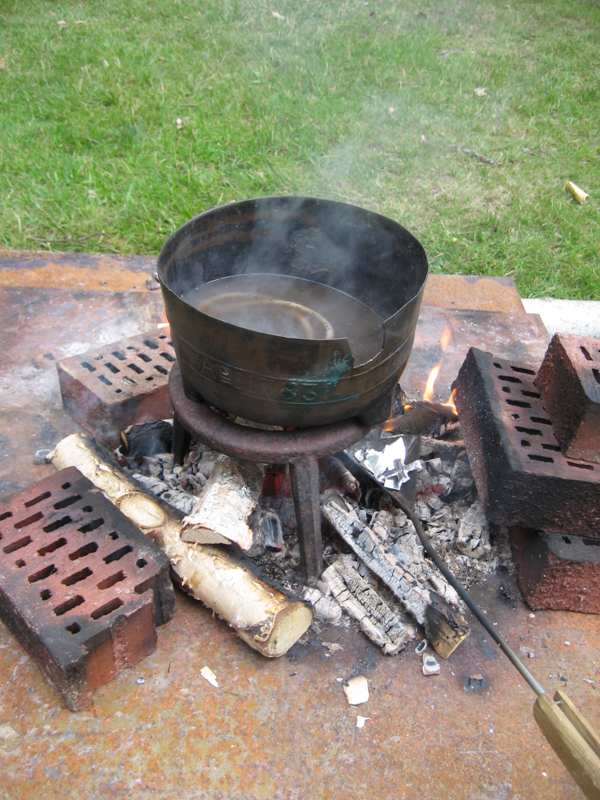 Steg 2. Sjudning av luntan. Nästa steg innebär att man  rullar ihop luntan och läger den i luten och sedan låter det sjuda strax under kokpunkten i en timme (notera gärna årtalet på kitteln…). Vi hade inte tillgång till en lina i linne eller hampa vilket är idealet utan bomull. Linan får inte vara tvinnad som ett rep som skulle tvinna upp sig när det glöder. Bomull är ett vanligt substitut nu för tiden och det är svårt att hitta linsnören som är bundna på rätt sätt, vad det nu heter. Vi passade också på att gjuta lite muskötkulor.