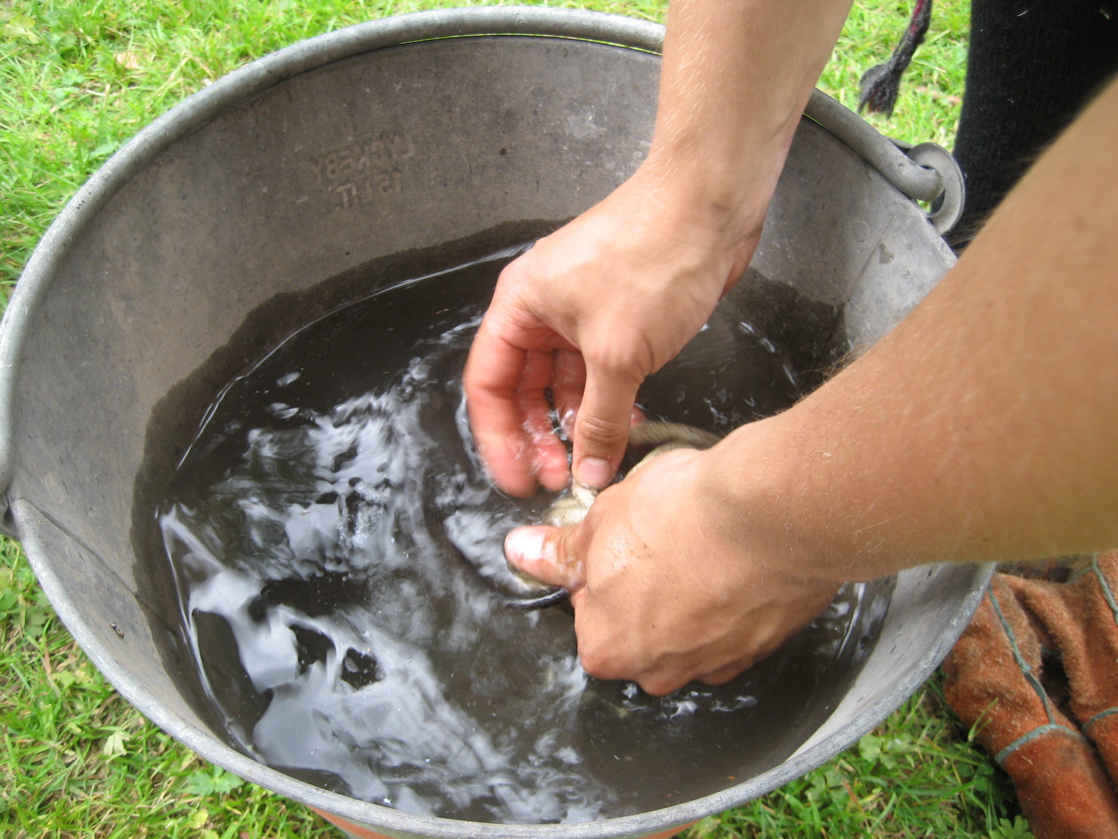 Därefter ska den tvättas i någon sur vätska, vilket i vårt fall blev ättiksprit upplandat med vatten för att neutralisera den basiska luten. Lämpligt kärl för detta blev Eriks sprukna trågförsök.