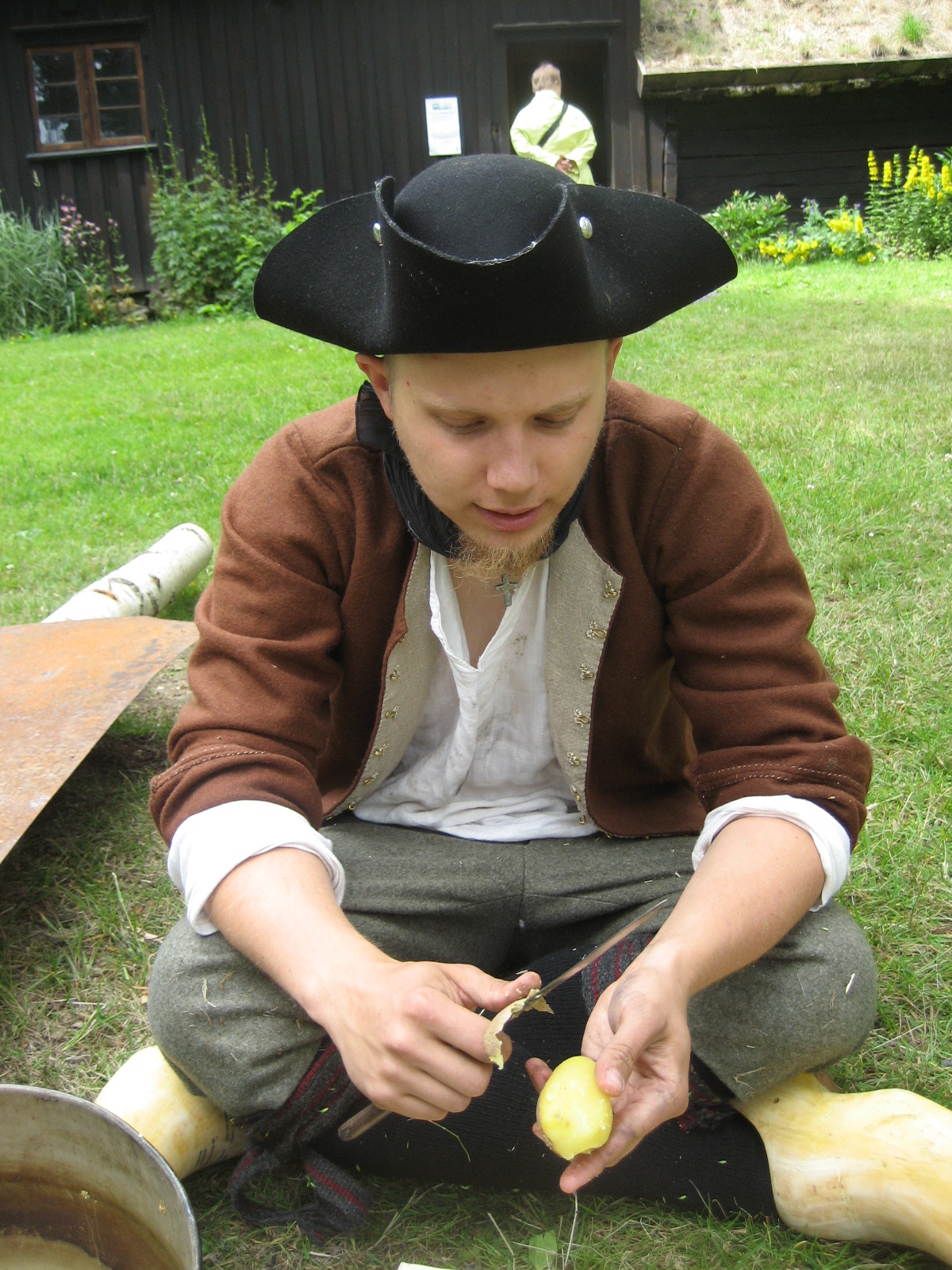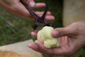 Därefter tog mosningen vid som vi gjorde i tråget jag gjorde dagarna innan. De borde tillverka nya tråg för dagen hem, de är mycket praktiska. Potatisstöten gjorde vi av en snabbt tillyxad björkbit. Vi arbetade potatisen utan tillsatser till inga klumpar fanns och den blev mycket degig och seg. När man smakade den var den likt ljummen italiensk sorbet med tapetklister i.