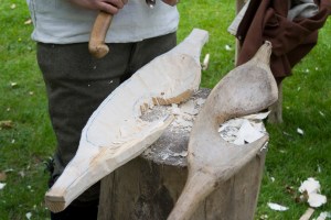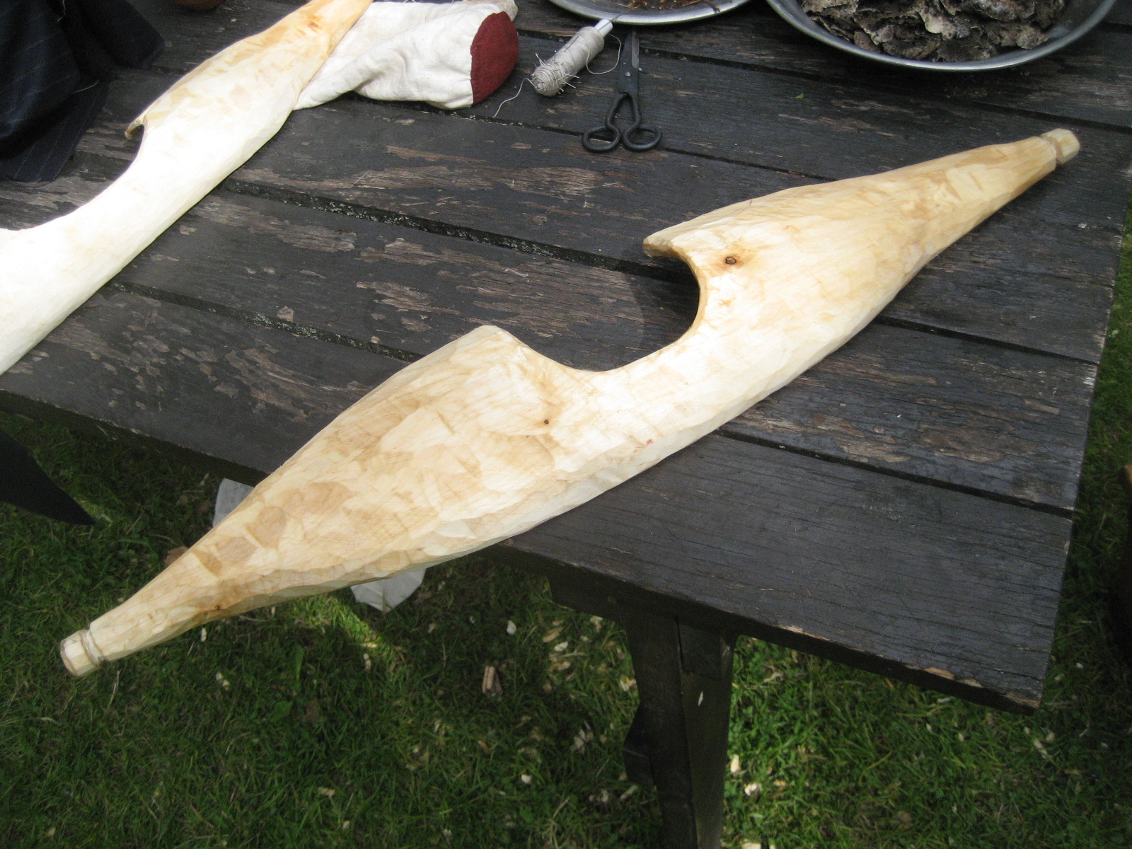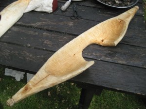 Tjäckelyxan gör ganska grova märken varför det kan vara bra att jämna till det med en skedkniv. I samma veva kan man tälja till halshålet med vanlig täljkniv så detta är bekvämt. Sen gör man fintäljning och gör ordning nockarna där man ska fästa repen.