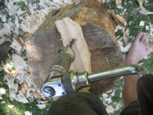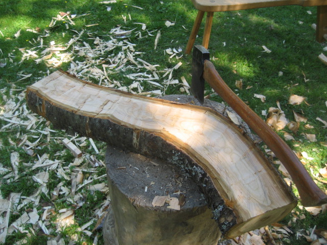 Steg 2. Grov bearbetning. Nu är det bara att ha sin skarpa yxa i beredskap och sätta igång och jobba så blåsorna blommar. Jag började med att hugga plant på båda sidor för att se på ett ungefär hur bärträet ska utformas.