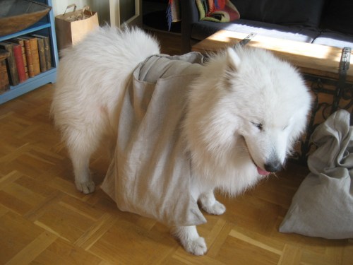 Jag har sytt mig en förvaringspåse som är inspirerad av Johans Källs artikel om en slags medeltida säck som man bär över axeln. (Om detta kan man läsa på: http://www.albrechts.se/pdfer/CarrysackfromMartebo.pdf) Liknande säck finns avbildad på Martebo kyrka på Gotland, tidigt 1300-tal. Den kan också med fördel hängas över större packdjur. Det skulle troligen också gå att göra ett par till en hund om man har lite kraftiga hampa och gör den lite mindre.