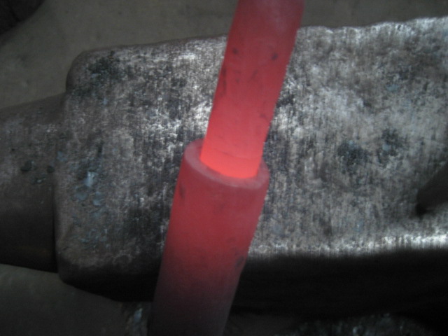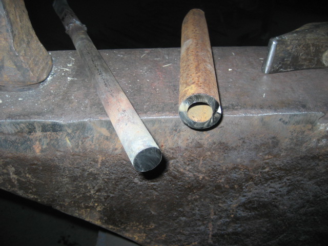 Experiment 1. Enkel bössa med tånge utsmidd direkt av röret. Jag knäppte igång fjäderhammaren och helt sonika smidde ihop rörets ände till en tånge. Det blev helt ok, vissa vällsläpp och krackeleringar i änden. Problemet blir att det blir svårt att få en snygg övergång mellan tånge och pipa. Den blir sluttande och försöker man bättra på med att slipa blir väggarna för tunna. Möjligen hållbara ändå men inte värt att chansa. Ingen metod att satsa på för närvarande. Möjligen kan man trycka en kall bottenplugg i loppet när pipan är varm.