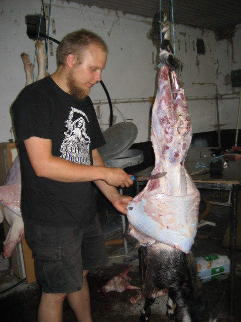 Jag var åter hemma hos mina arbetsgivare och slaktade. De har börjat skära ner på getpopulationen på gården och finns chansen att köpa billigt kött så hänger jag gärna på. Jag har aldrig slaktad get förut och det var otroligt lärorikt att gå från levande djur till färdigstyckat. Nils-Arvid säger i Arbete och redskap att getslakt vanligen utfördes i oktober av kvinnorna på gården. Två fel där då. I vilket fall ska det bli spännande att smaka på köttet, getterna är ju inte direkt kända för sin köttproduktion.