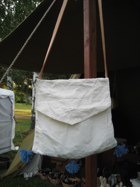 När jag var på Stallarholmens vikingamarknad sydde jag klart en medeltida axelremsväskor. Dylika väskor är vanligt förekommande i den samtida konsten och under 1200-1300-talet är det vanligt att de också är försedda med tofsar. Min väska är sydd i vit linkanvas med blå tofsar i ullgarn. Axelremmen är gjord i läder med ett enkelt 8-format spänne. Inte så mycket att tillägga där direkt. Väskor är kul.