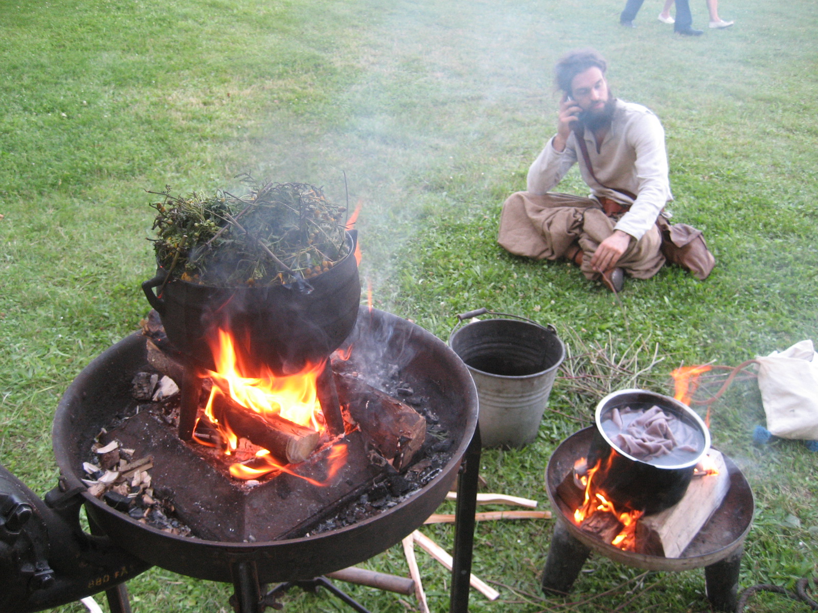 För att spara tid betade vi yllet samtidigt som vi kokade växtdelarna. Utav växten tog vi endast blad och blommor och tryckte ner så mycket vi kunde i grytan. På med vatten och koka i ca 1,5 timme. Tyget betade vi i en annan kastrull med vatten och alun. Det får inte bli för varmt i den grytan. Vi betade i över en timme ca. Tack till tattarklanen för att vi fick låna den trevliga ässjan ett tag och Svarta Katten för alun.