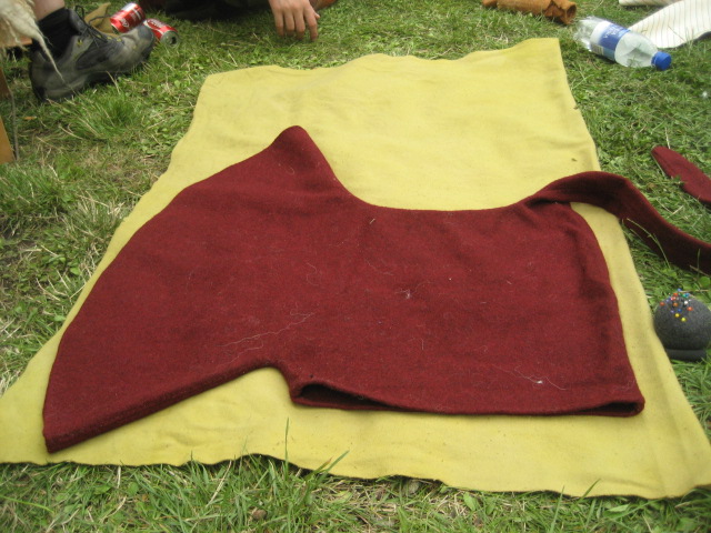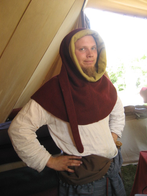 English summary: During the so-called medieval week on Gotland we did some dyingexperiment. To produce a nice snot-like colour we used a plant called Tansy which has yellow flowers. We cooked the flowers and its leafs for 1,5 hour and dyed one meter light wollen fabric. The fabric was pre-mordanted with alum for 1,5 hour. The fabric was in the colourbath for an hour, then the pot was remowed from the fire. The newly dyed fabric became a lining for my old liri-pipehood. I´m very pleased with the result and its sharp contrasts.