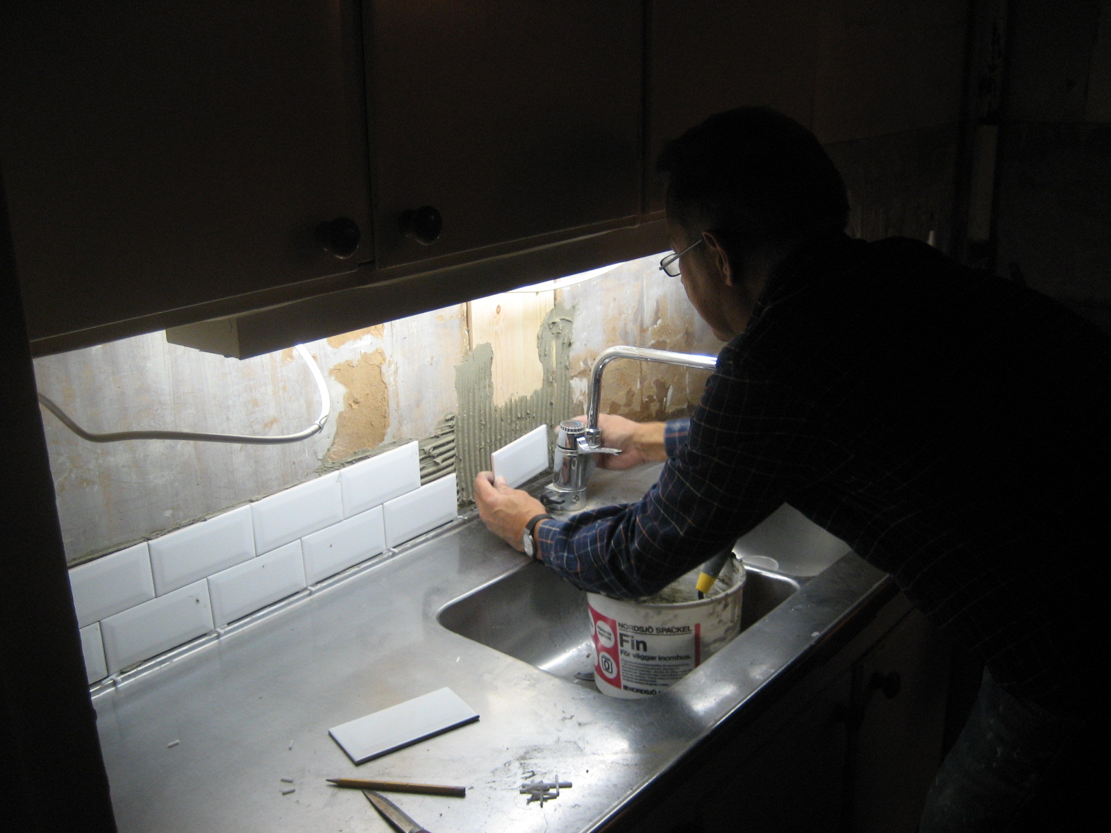 Pärlsponten sitter på plats i taket i lilla extradelen av köket. Blev bra, första momentet i huset helt utan komplikationer.Pappa sätter kakel i vid diskbänken.
