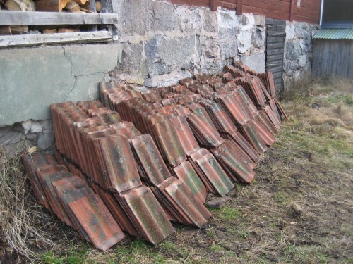 I övrigt har vi köpt taktegel! 2500 pannor för drygt 1kr/st. Riktigt kalaspris, särskilt eftersom plattorna var nedplockade. Om ni läst förra inlägget kommer ni ihåg att det var tvåkupigt taktegel på de gamla korten och nu ligger det inte så roliga svarta betongpannor. Här nedan ser ni de två första lassen, ca 650 pannor. Bytet av plattor blir till försommaren.