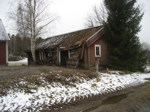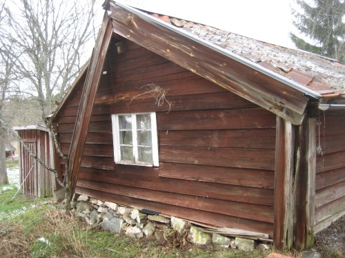Det kan tyckas banalt att sörja hus, de är förgängliga ting. Men ett hus är en kulturhistorisk kvarleva, ett minne som viskar om gamla minnen och levnadöden. Vad som syns på bilden är ett offer för den i Sverige utbredda uthusdöden. Naturen har fått sin gång utan att människans hand tagit vid, huset håller på att komposteras, bokstavligen. Det som hade börjat med läckande tak för, 10-15 år sen. Det finns inte så många låga tvåkammarstugor kvar, särskilt inte med kilsågad fjällpanel. Lerklinade väggar, målade med rosa grund med svart stänkmålning, dagens inredare kan gå och duscha. Huset är troligen 200 år, kanske mer.