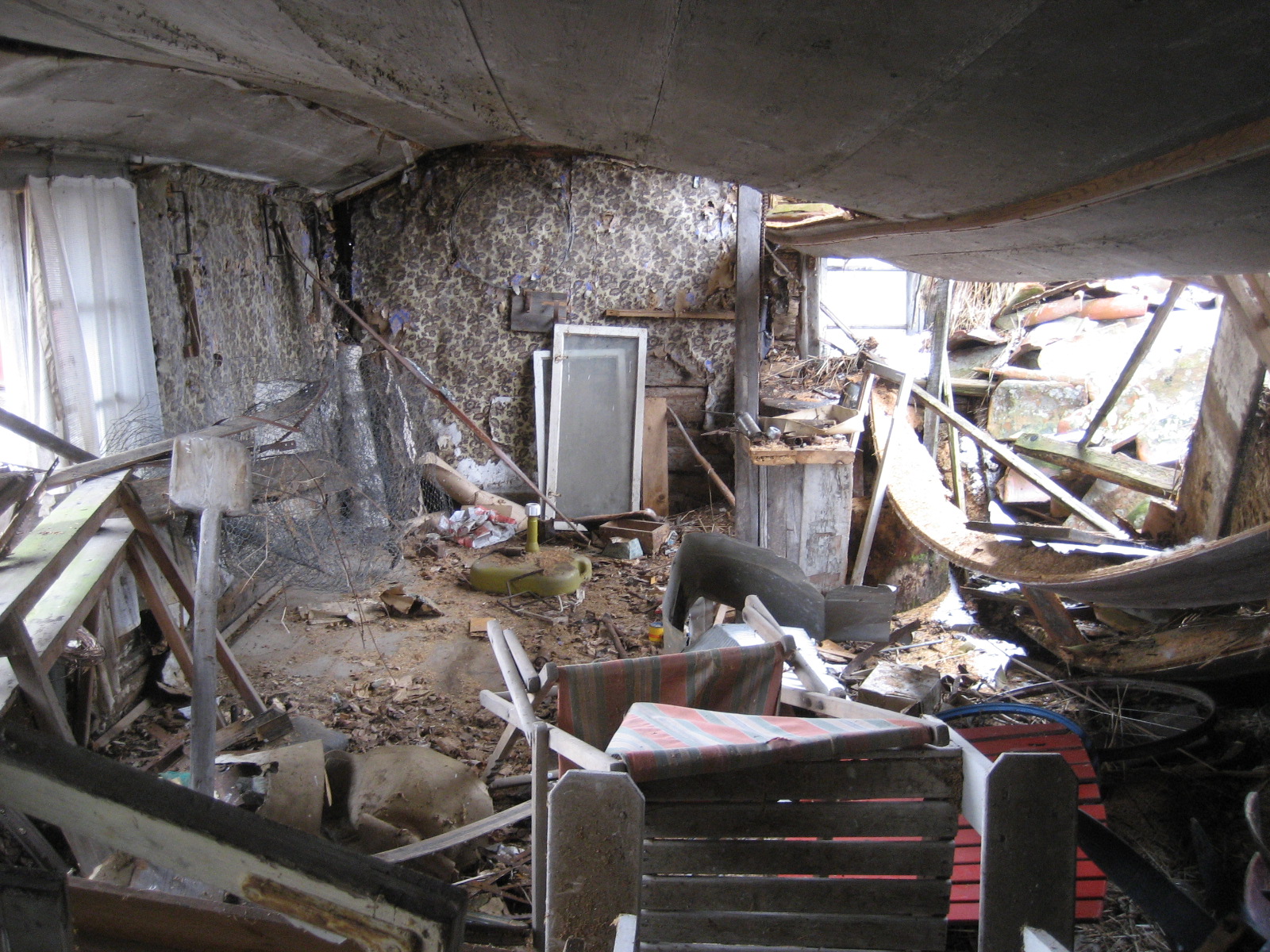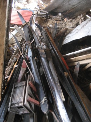 En del gick att rädda, det mesta inte. Det blev lite äldre utemöbler, en engelskt röd gustaviansk skänk som saknar en dörr, 5 kg torrpigment till rödfärg, vinbuteljer, champangeflaskor och pilsnerflaskor från sekelskiftet, en solstol, etre förskinn från 1800-talet (kommer i specialartikel), näver, diverse verktyg, ett fönster, en ask blyhagel, hörnhylla, ett skraltigt slagbord, fronten på en sällsynt sönderrostad Näfvekvarn nr 6, otaliga spik, krokar, hakar och skruv och två par skidor i trä. De avlidna ägarna, som var bröder var skidgalningar. Säkert 25-30 par träskidor återfanns i huset, samtliga sönderåkta med sprickor, lagningar och tjocka lager av tjärning.