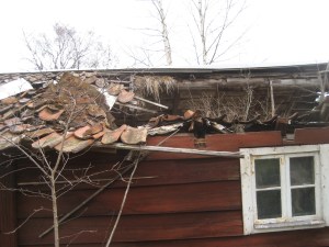 Angående teglet syns det inte så bra men det är frostsprängt, spruket och gropigt. Baksidan av husets tak har rasat in så det blir inte så många hela pannor kvar som räcker till något tyvärr 😦