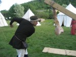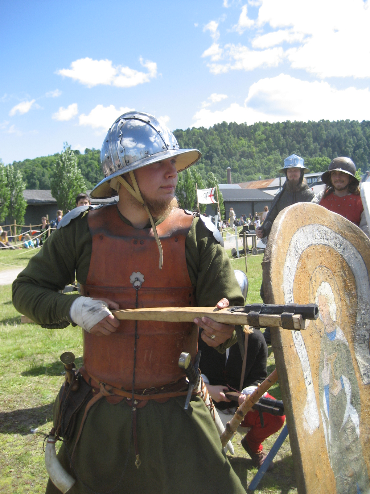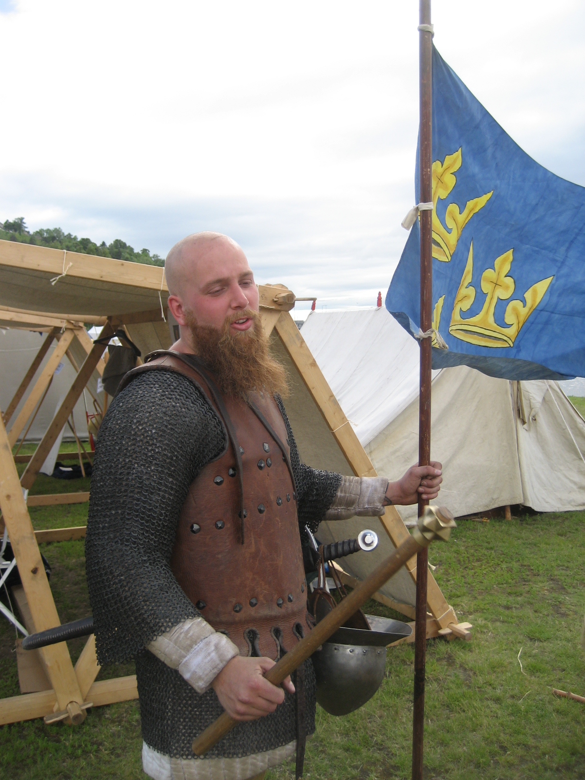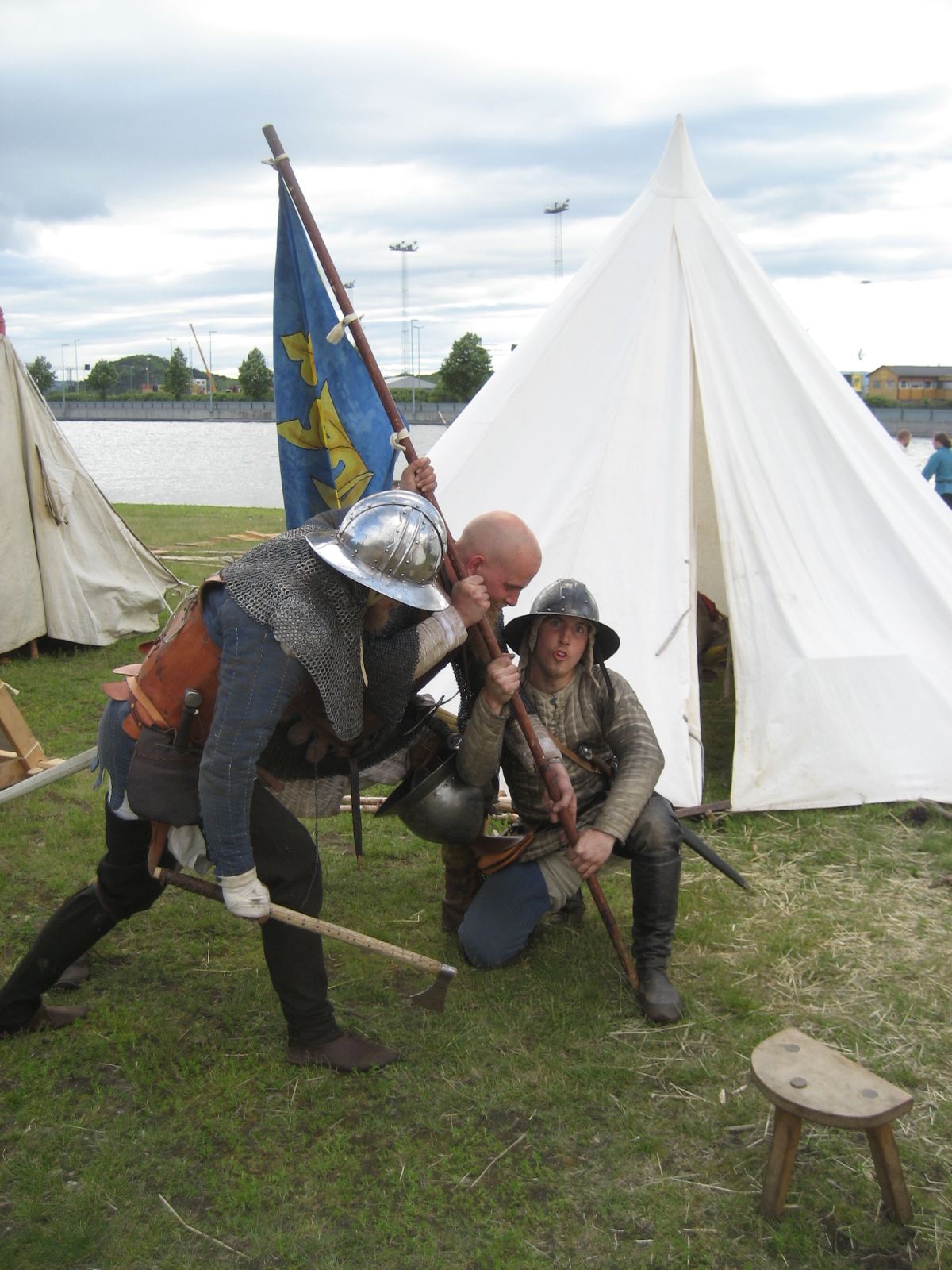 Lördagens slag har jag dessvärre inga bilder på då jag själv var högst inblandad i det. Det lär dock cirkulera bilder inom kort. I korthet gick det ut på att vi sjösattes i två medeltida småbåtar och blev beskjutna från land med en stor kanon. Vi sköt tillbaka. Det visade sig vara en småpsykotisk upplevelse att uppleva. Med en roddare och två skyttar, fullt rustade med fanor, svärd och grejjer. Blött och dant blev det och när krutmolnen rullade in över vattnet spelade Patrask ”Smoke on the water”. Psykadeliskt. Vi kan numera titulera oss Albrechts marinkår. Väl i land mötte vi upp med några norrmän och vi jagade bort en hög plåtniklasar och batterister för att sen ha ett uppvisningslag på tornerspelsplatsen. Det blev bra slag och norrbaggarna slåss schysst.