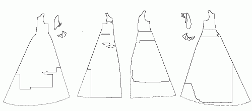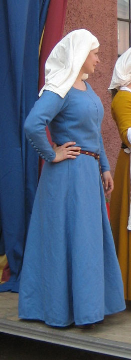 Detta är den typiska mitten av 1300-talet-kjorteln 1a. Åtsittande, båtringad med knappar på ärmsluten. Inga vidare finesser. Skärningen är liknande den som återfinns i Margaretas gyllene kjortel med fyra våder (se bedrövligt föråldrad bild nedan). Denna skärning är praktisk på så vis att om vi någon gång vill så kan vi sätta knappar framtill, eller snörning. Min frus kurviga figur gör att är svårt att göra ett mönster utan knappar som sitter åt, men jag tycker vi lyckats skapligt (bilden är inte helt rättvis här). Anna-Maria vill ha en bekväm kjortel att kunna arbeta i, liksom bråka, gestikulera och skjuta båge.  ”Jag vill inte sitta på en filt och stöna bara för att jag är kvinna”, som hon brukar säga.