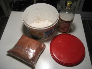 Korps (www.korps.se) sponsrade färgningsprojektet med ett halv kilo krapp i pulverform och eftersom jag inte kunde veta hur många intressenter som skulle dyka upp så blötte jag upp hela laddningen dagen innan. Krapp ska ligga och dra minst 12 timmar innan färgningen och ju mindre beståndsdelar färgnämnet är desto bättre är det. Maria skrev något om att i de medeltida färgrecepten förekom det att man hade i en okänd summa vinäger i krappen. Det är inte helt ovanligt i gamla färgrecept att det blandas i allt ifrån benmjöl, regnvatten till krabbskal och framför allt urin, helst mansurin. Dessa ingredienser har okänt syfte medan andra ofta idag ersatts med annat. Jag ville inte vara sämre så jag hällde i ”lite” äppelcidervinäger jag med.