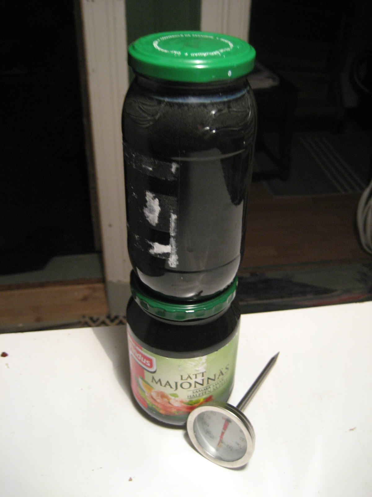 Som vid vanlig indigofärgning gör man en stamkyp, en koncentrat som sen spädes i färgbadet. Min erfarenhet är att det går åt något mer indigo med denna sort. Jag är verkligen ingen expert på indigo vilket framkommer i mina försök. Det är första gången som jag prövar det på egen hand. I två burkar blandade jag två kypar. Några skedar blandas först i lite vatten som sedan späs med mer vatten. Temperaturen ska hålla 50 grader och det gäller att röra försiktigt då så lite syre som möjligt ska komma ner i kypen.