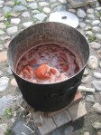 I två timmar höll jag temperaturen och lät det svalna sakta till eldens falnande. Jag rörde runt lite då och då. Detta är helt klart den färgningen som jag är mest nöjd med. Någonsin. Det blev en grym, dov röd på grund av den höga färgkoncentrationen. Här ser du resultatet, garnnystanet kommer längre ned. Bilden här är något ljus, färgen är något kraftigare.