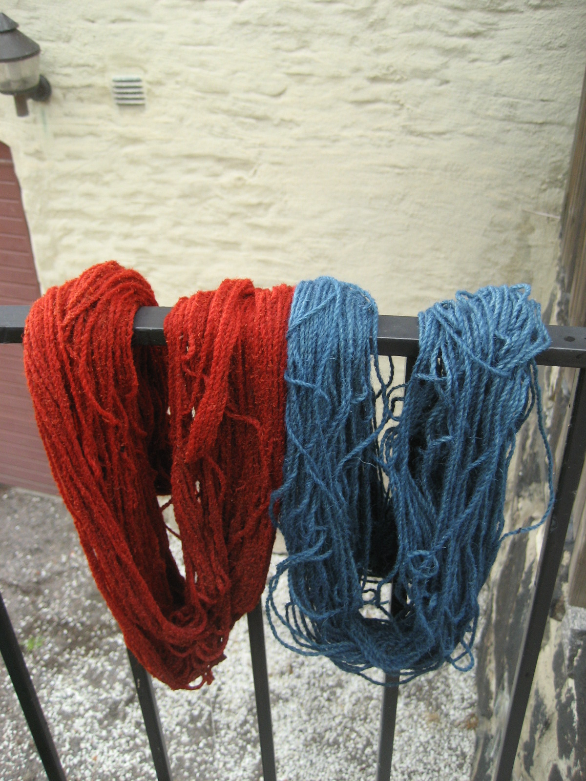 Jag sänkte ner ett fuktigt garn långsamt och höll det sedan under ytan och rörde försiktigt. Det ska helst vara under ytan hela tiden. Efter 10 min tog jag upp garnet och när garnet kom i kontakt med syret i luften så blev det mycket riktigt blått och en ganska bra blå. Rätt nöjd. Syns här med krappgarnet.