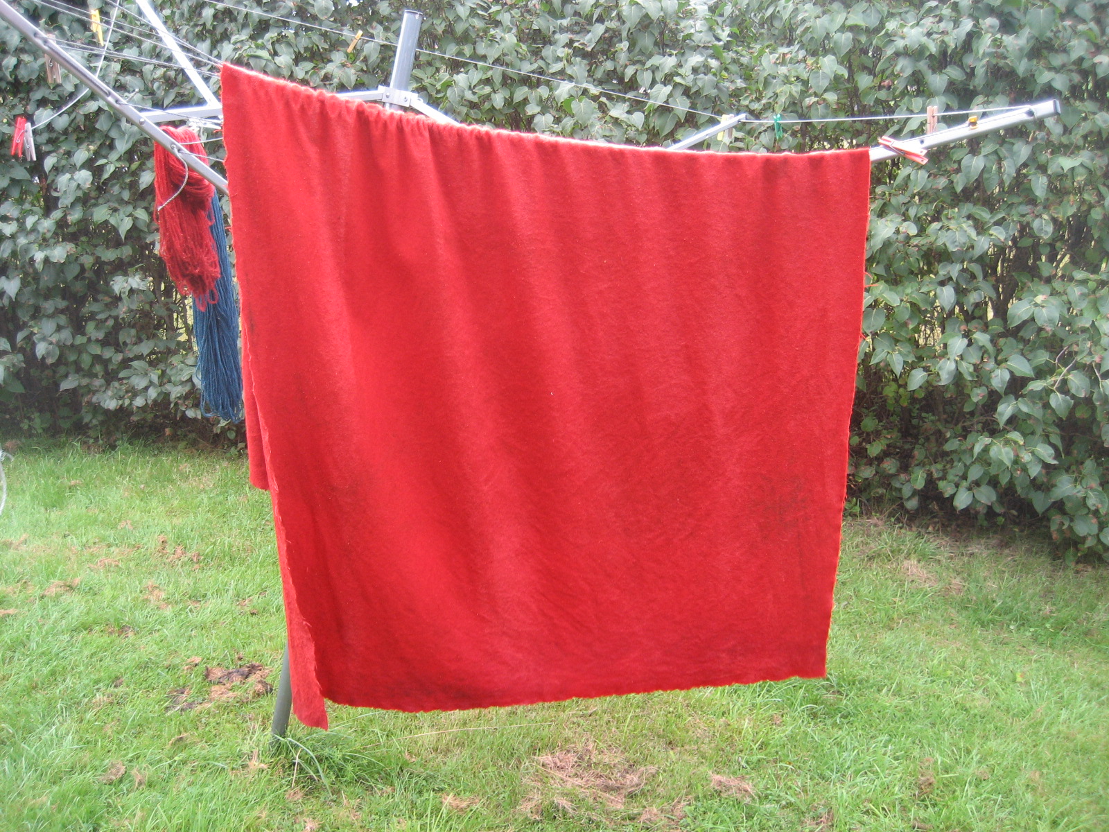Jag hällde i färglösningen i ca 16 liter vatten och rörde ordentligt. Därefter i med tyget och garnet och håll badet strax under 70 grader. Det är viktigt att det inte blir över ca 72 grader då färgämnet i krappen ändras från röd till brunt. Brunt känns som ett nedköp i jämförelse med fräsig röd.