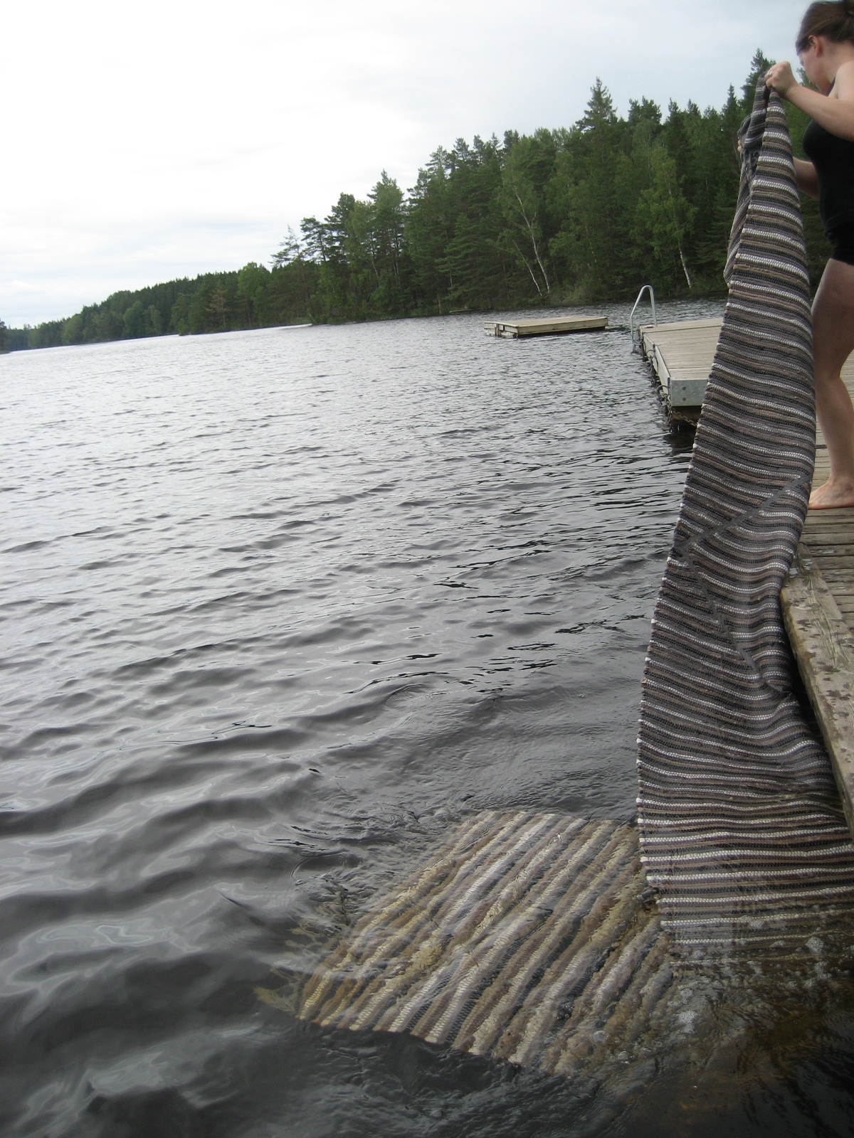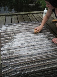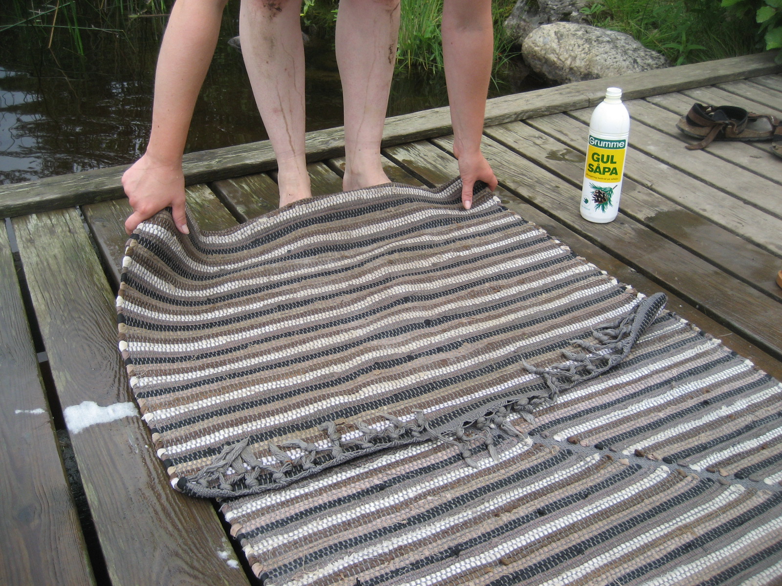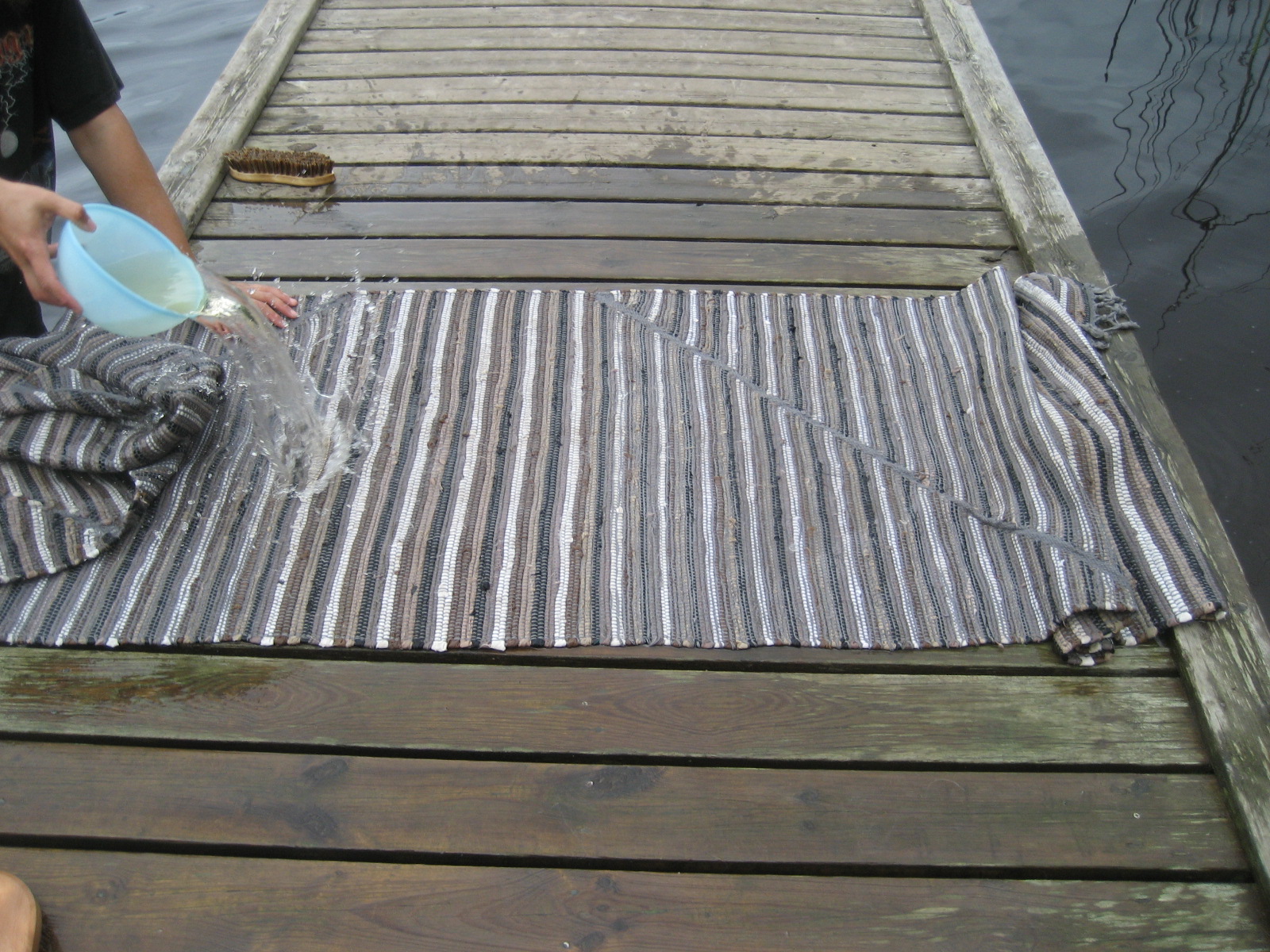 Ta mattrullen och spänn dina muskler en sista gång till ära för den rena, såpskurade mattan… Håll den i ena sidan och slå den andra mot bryggans kant. Från mitten och ut så vattnet släpper mattan.