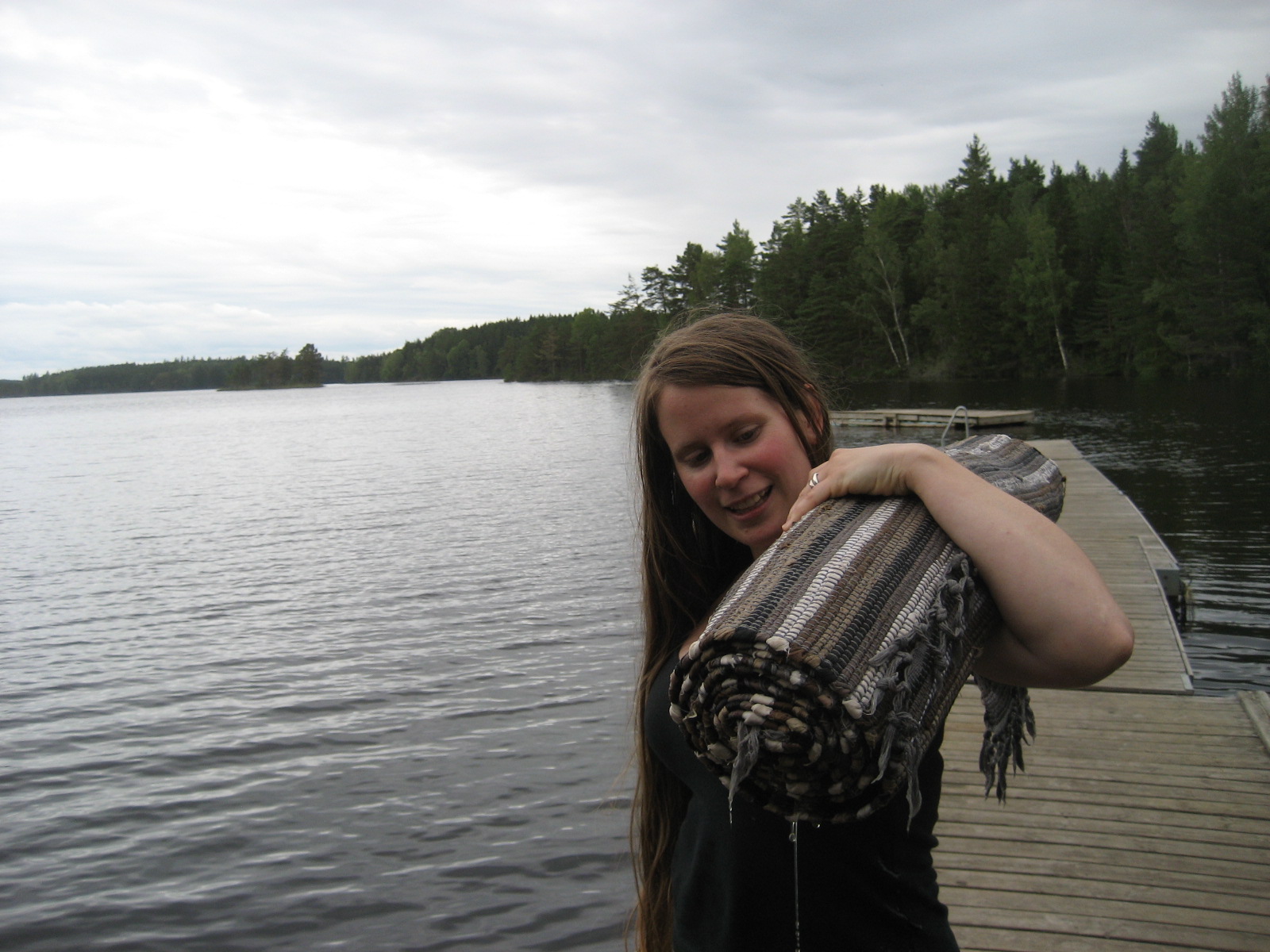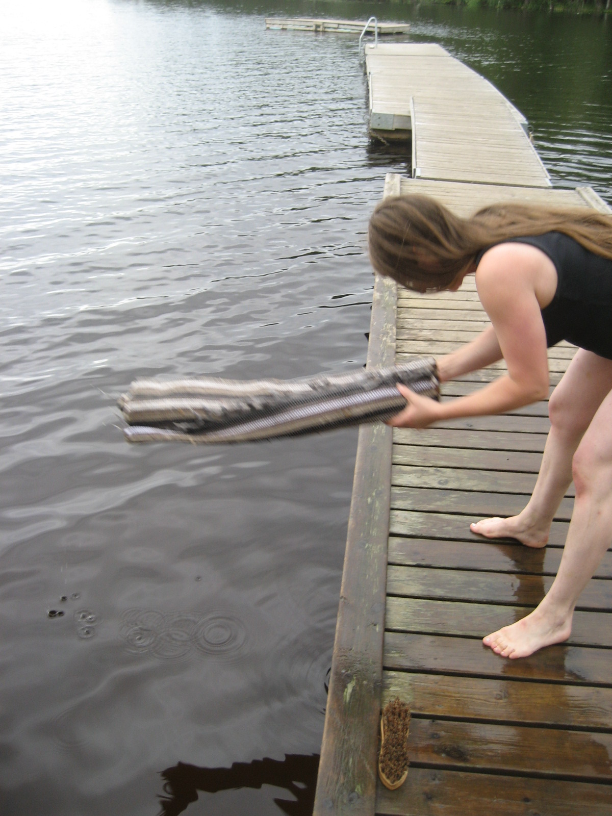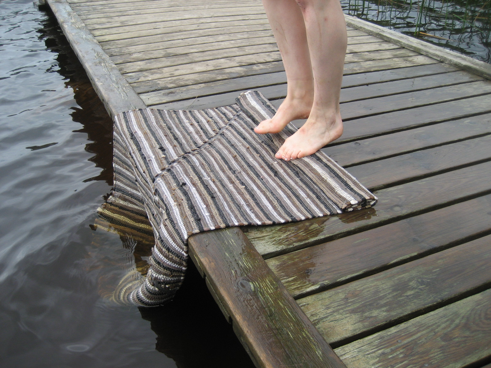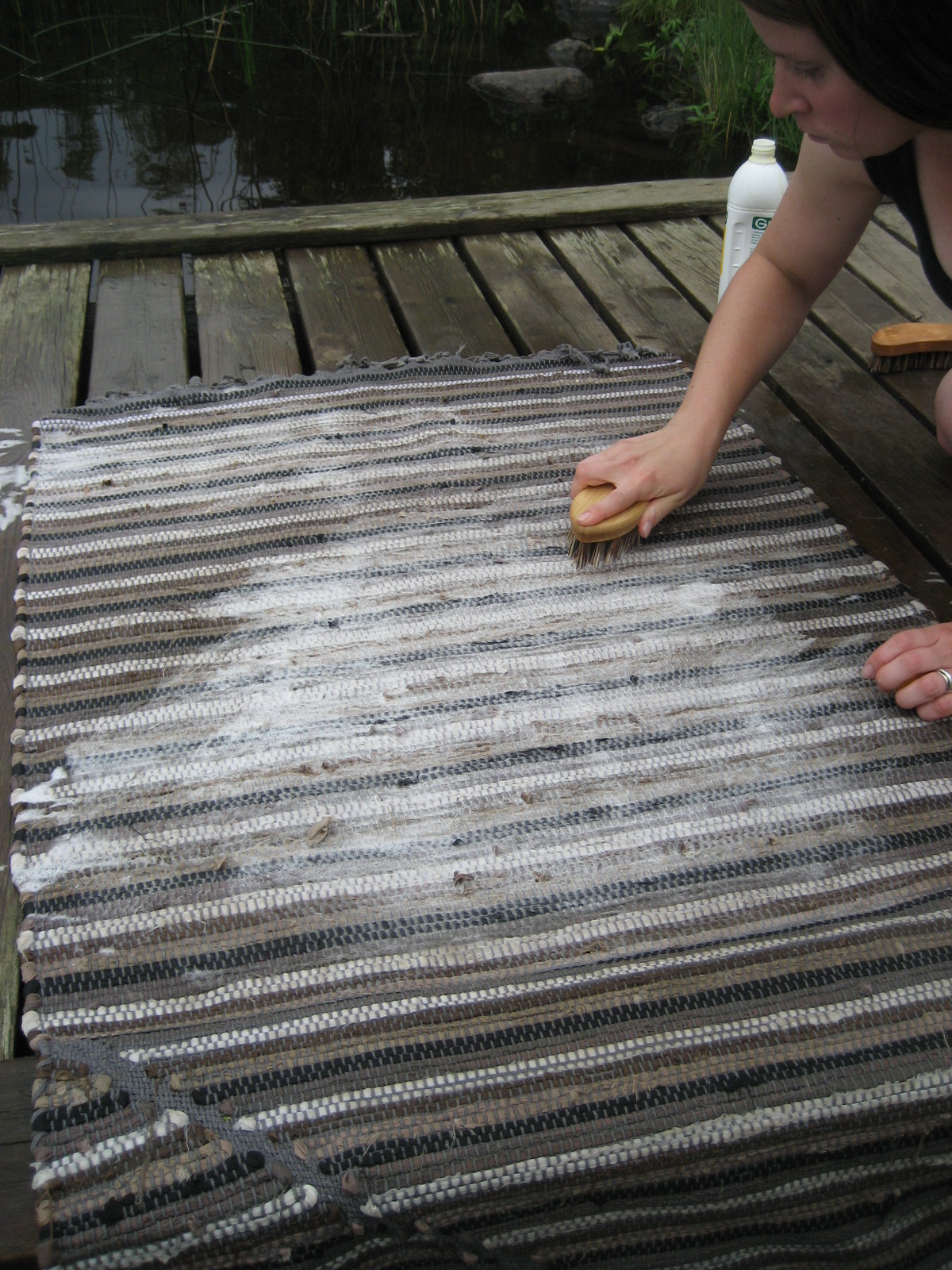 Ta mattrullen och spänn dina muskler en sista gång till ära för den rena, såpskurade mattan… Håll den i ena sidan och slå den andra mot bryggans kant. Från mitten och ut så vattnet släpper mattan.
