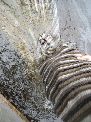 Genom att hela tiden fylla på och skura vattnet ur mattan så försvinner smutsen ner i sjön. Behandla hela mattan så, ja; båda sidorna(!).