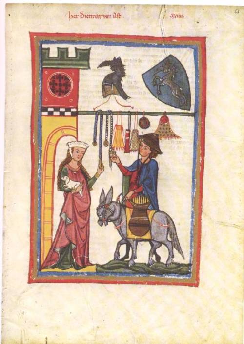 Väskan är mycket enkel till sin konstruktion och mäter 12,5 x 20 cm exklusive tofsar. Det finns gott om bildmaterial och existerande förlagor från 1300- och 1400-talet på liknande modeller av väskor. De finns i ylle, siden, brokad, täckbroderade och även stickade. Just denna väska är inspirerad av denna välkända bild ur Codex Manesse från tidigt 1300-tal. Det som varit mest tilltalande här är just färgschemat på den gula väskan liksom storleken.