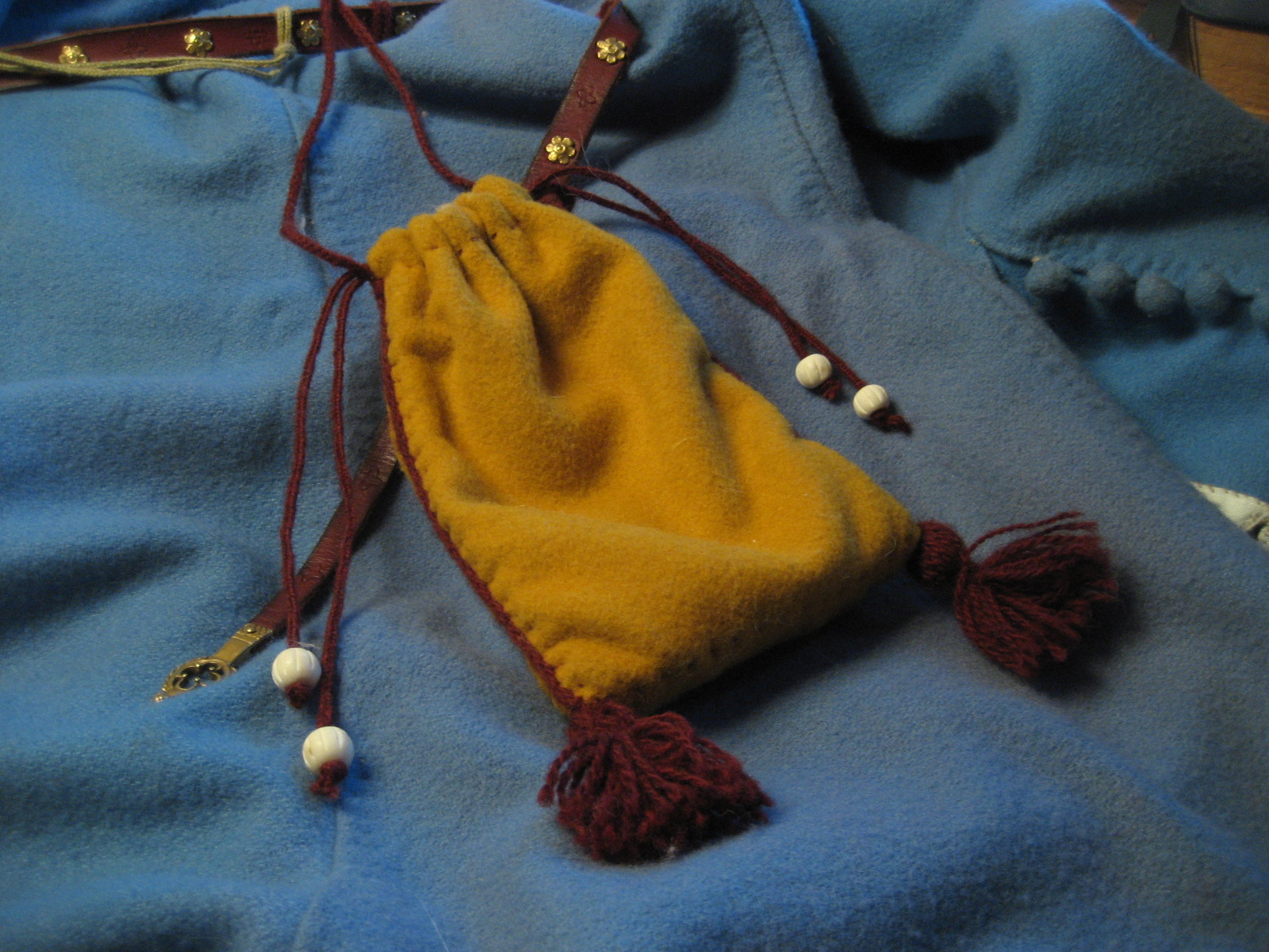 Förra veckan råkade jag av en händelse hitta några bitar saffransgult kläde i spillådan i syateljén på mitt dåvarande jobb. Jag tog hem det jag fann med förhoppningen att det skulle räcka till en halv struthätta. I ett fåfängt rus att skapa en sen kväll skred jag till verket att sy en liten tofsväska till Anna-Maria. En väska hon kunde bära på Söderköpings Gästabud som hon tillfälligt skulle bevista på nåder ifrån sin Malungska fångenskap.