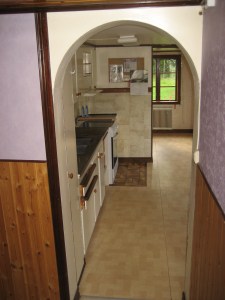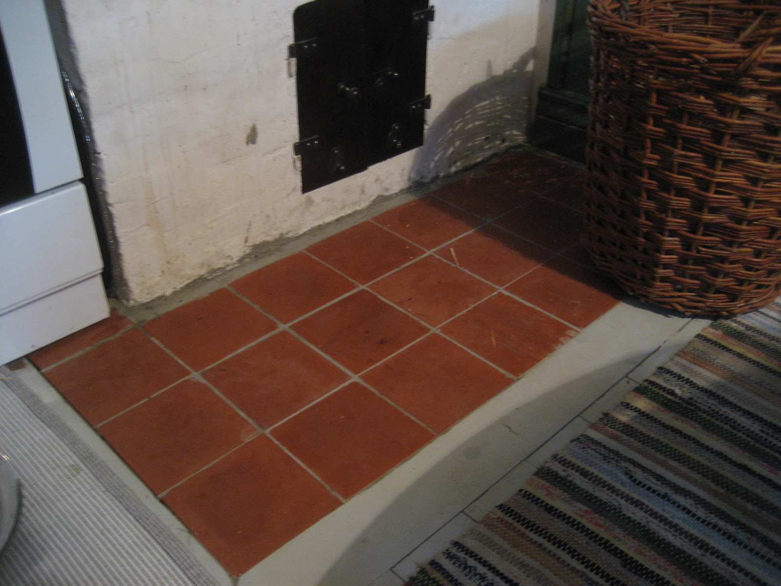 Vi la sen kakel uppepå vilka är lätta att rengöra och dessutom tidsenligt. Vi valde billigt vitt kakel. Framför spisen la vi de gamla IFÖ-tegelplattorna som jag slet loss från gamla badrummet. Dessa var ett härke att rengöra då de hade ett tjockt lager lim på sig. Med hjälp av skrapor och lösningsmedel lyckades vi emellertid. Men det var då ingen gamman utan bara ett gissel att kladda med.