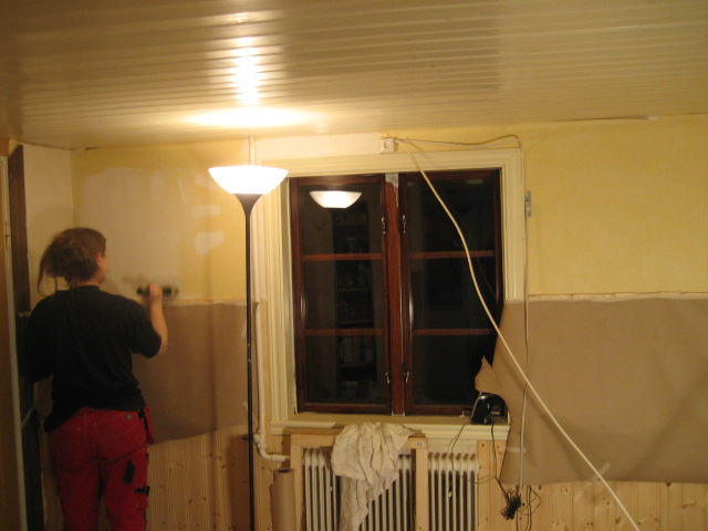 På överblivna ytor tapetserade vi med en neutral tapet som vi sedan målade med en emulsionsfärg som till sin komposition fungerar som en äggoljetempera. Det är en färg som innehåller vatten och linolja vilka förenas med en emulgator (som ägg i äggoljetempera) som i detta fall är ett cellulosalim. Ytan blir mycket lik limfärg fast vattenfast. Färgen är en varm vit och kan tänkas bli ett underlag för en schablon någon gång men den funkar även bra i sig med sin neutrala karaktär. Att måla med denna färg är raka motsatsen mot linoljefärg då den torkar apfort och man bör skynda sig att stryka ut. Denna färg fungerar också utmärkt på putsade ytor så alla detaljer vid vedspisen är målade med densamme.