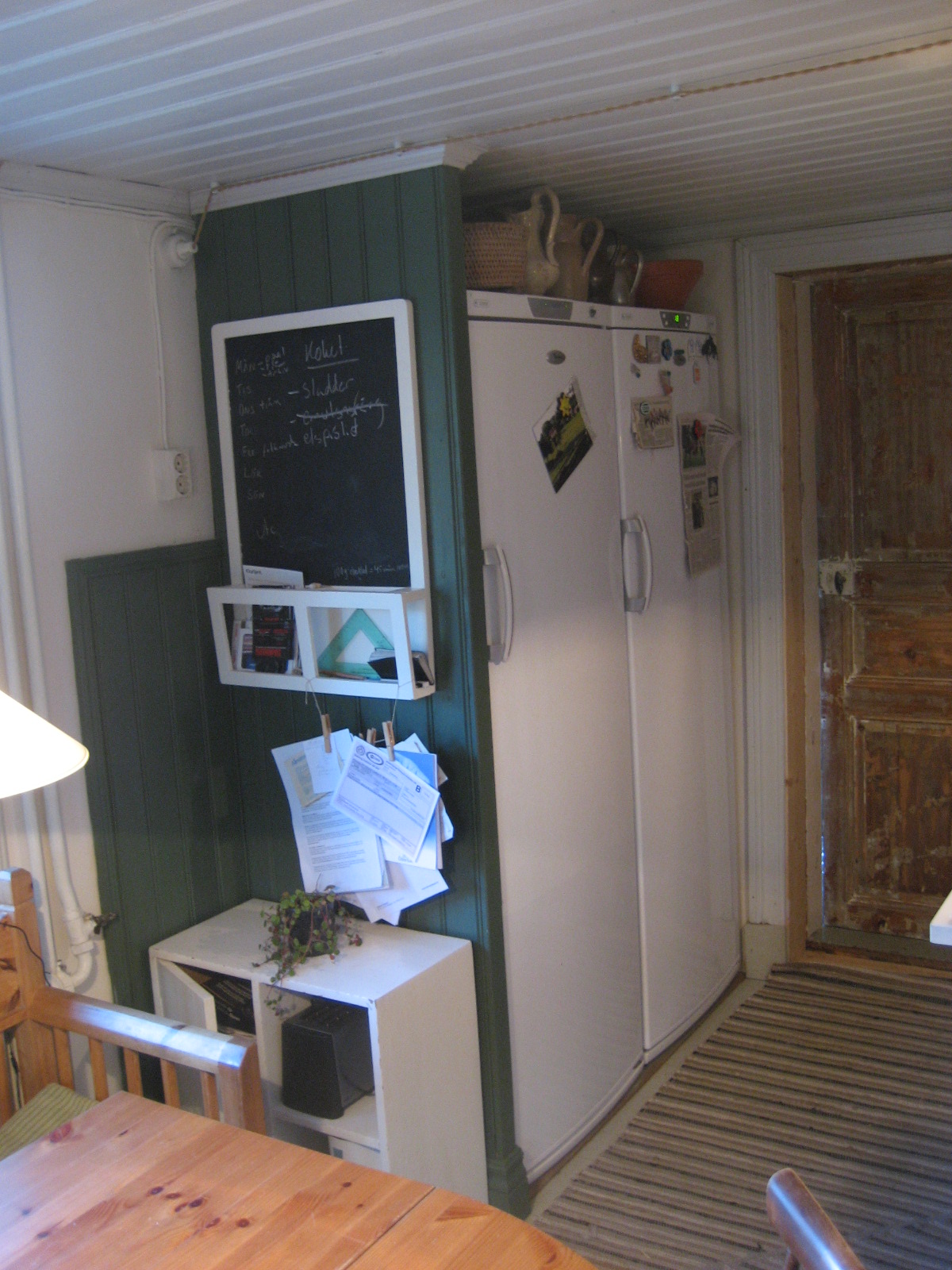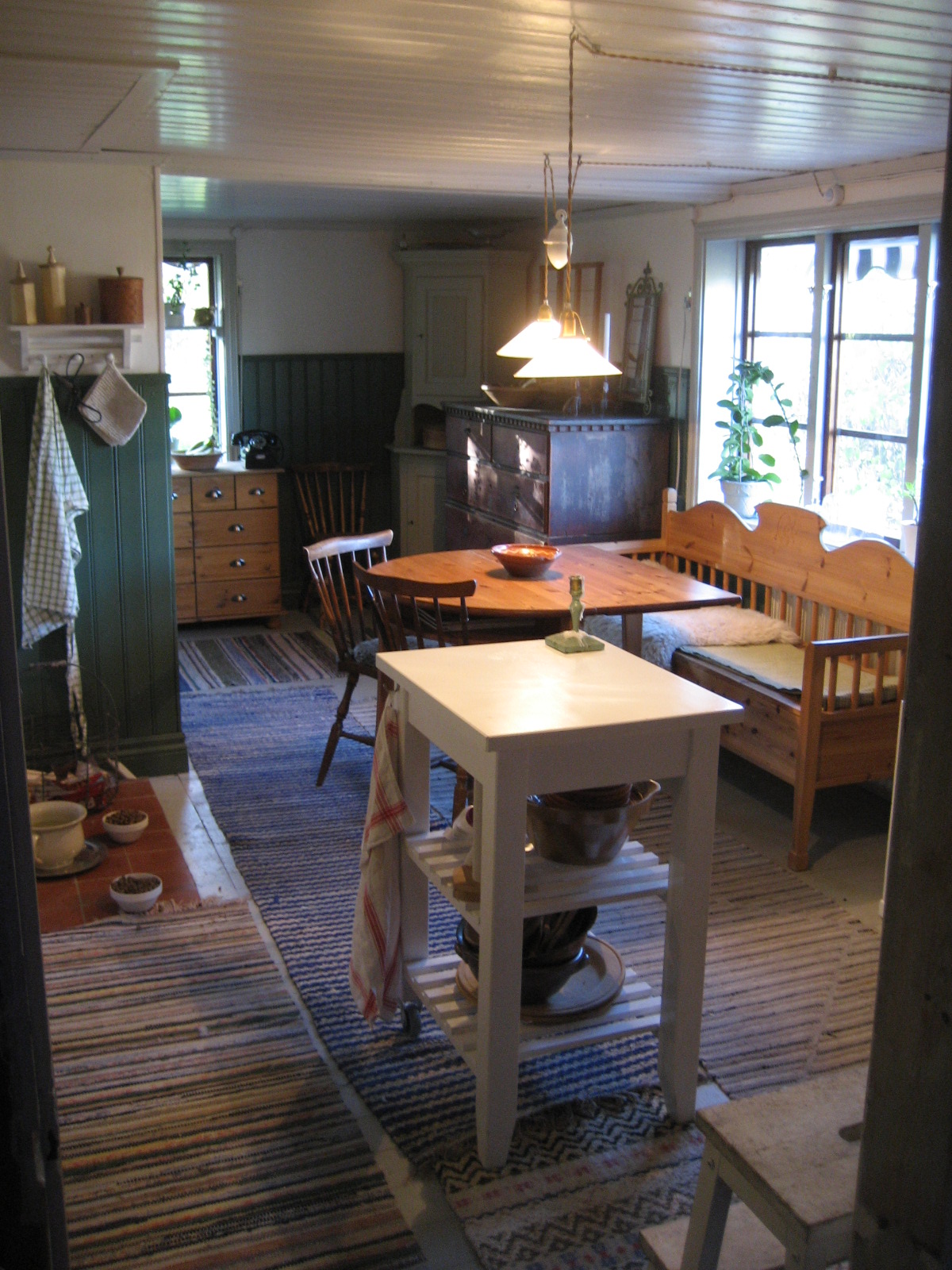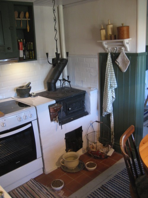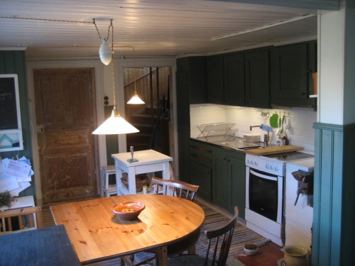 Tidigt bestämde vi oss för att försöka skapa oss ett trevligt sekelskifteskök i kombination med vissa moderniteter. Gamla kök som är som moderna kök är en myt, man måste kompromissa med den historiska autenciteten. Elspisar och diskbänk med avlopp drogs in i det här huset på 50-talet, det är ingen idé om att hymla om att det skulle vara ett tidsenligt kök. Ett riktigt, svenskt sekelskiftes kök attraherar troligtvis en mycket liten publik idag. Men med naturmaterial, linoljefärg, vedspis, gammal el och pärlspont vill vi visa på vår kompromiss.
