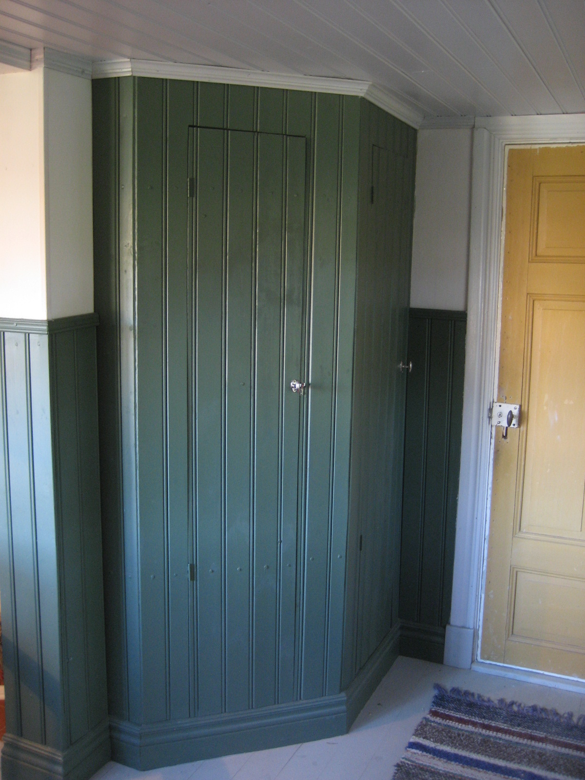 Vi målade alla träytor med linoljefärg. I taket är det en ljus grå, på golvet en mörk grå och på väggarna en rejäl grön. Det är färger som populära för tiden, liksom mintgrön, träimitationer, guldockra, rosa med flera. När man målar med linoljefärg är nyckeln armstyrka och tålamod. Linoljefärg påstrykes så tunt som möjligt i flera lager, ett gammalt talesätt säger att du ska måla så tunt att du har mer kvar i burken när du är klar än vad du hade när du började. Lägg till en lång torktid, vilket är frustrerande om vi till exempel snackar om golvet så fått fyra strykningar. Vad är vinsten? Förutom den rent historiska aspekten så talar vi här om en ogiftig färg, inga starka lösningsmedel, en färg som har en värme och lyster som ingen annan och som kommer åldras med värdighet.