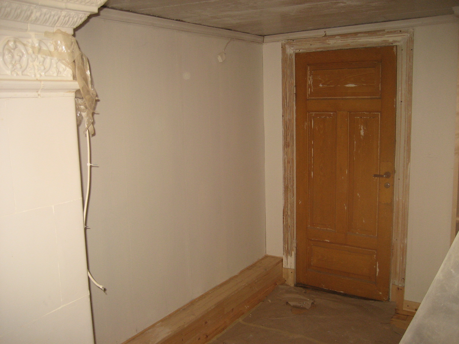 Alla dörrar och fönster fick sina brunbetsade ”allmoge”-hyvlade brunbetsade avskräden till list avlägsnade och förpassade till vedpannans eld. Samma öde gick alla andra lister i rummet. Dörrarna och fönstren kröntes istället med fräsiga feta franska foder från 1800-talets andra hälft.