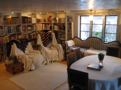 3. Blir alldeles mållös, så vackert! Är speciellt förtjust i soffan (en Karl Johan måhända?) kakelugnen och självklart bokhyllan. Som bokfantast/samlare/narkoman är bokhylleväggen given, framför allt med en make som dyrkar ”bra att ha” facklitteratur.