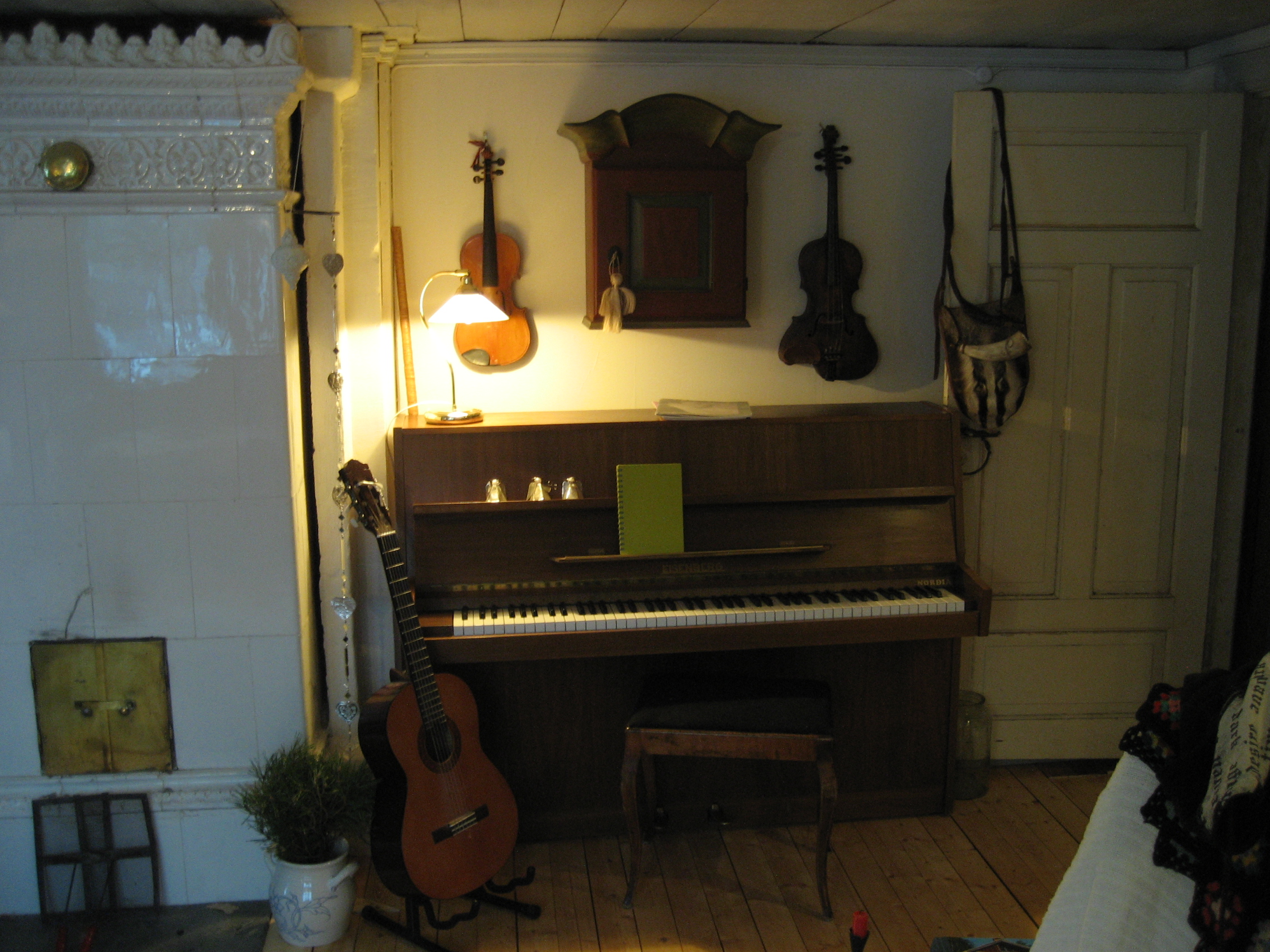 Här ser ni också vad som blev kvar av den rivna väggen med vitrinskåpet. Träsockeln som blev kvar döljer värmerören och här blev Anna-Marias musikhörna helt enkelt.