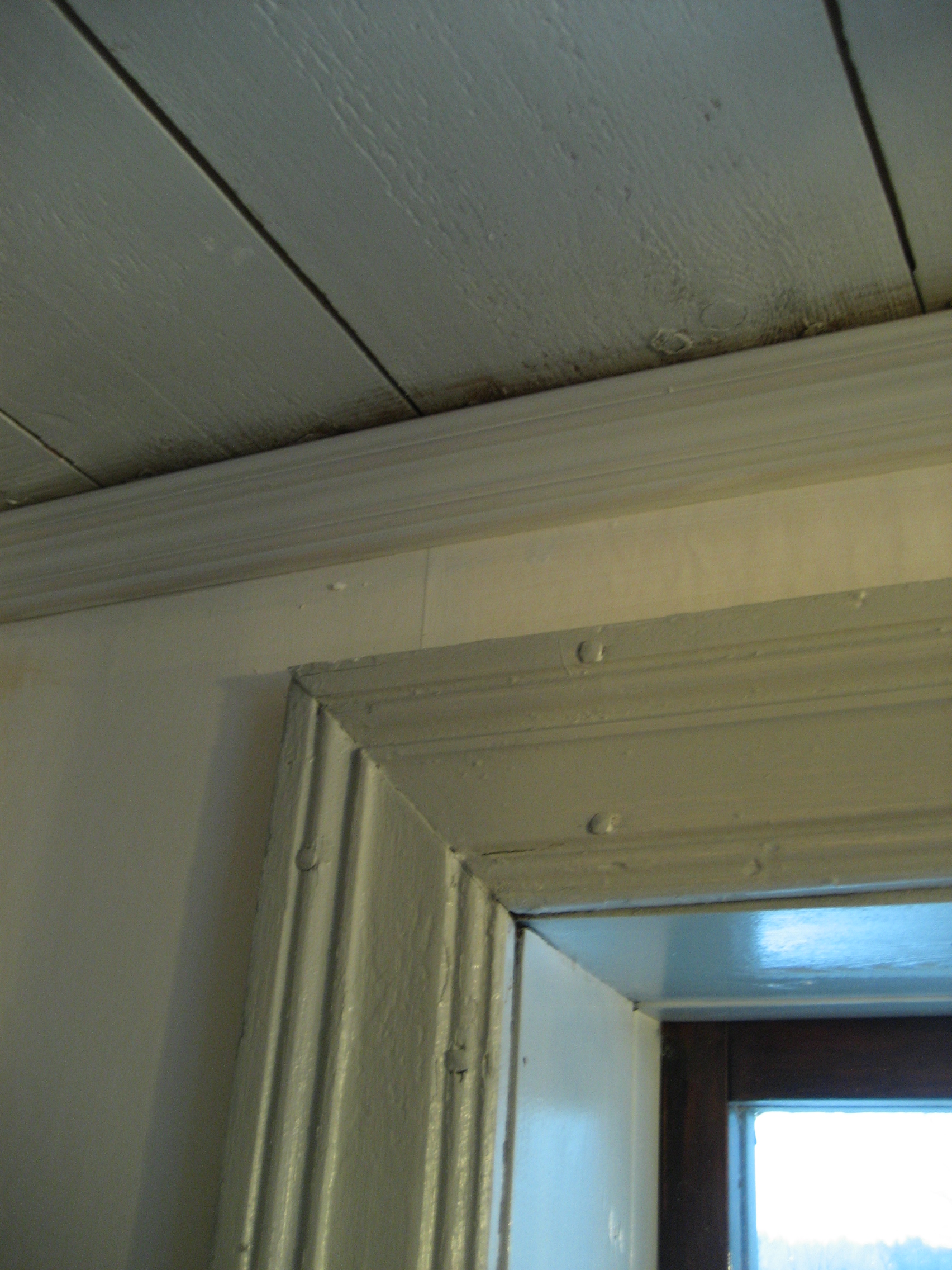 Taklisten har vi köpt av samma hyvleri och är en kopia på en äldre. Totalt är det tre grå nyanser, en ljus i taket som skänker rummet välbehövlig rymd och fodren är en mörkare nyans och golvlist något mörkare. Allt spikat med gammal klippspik.