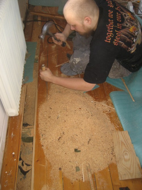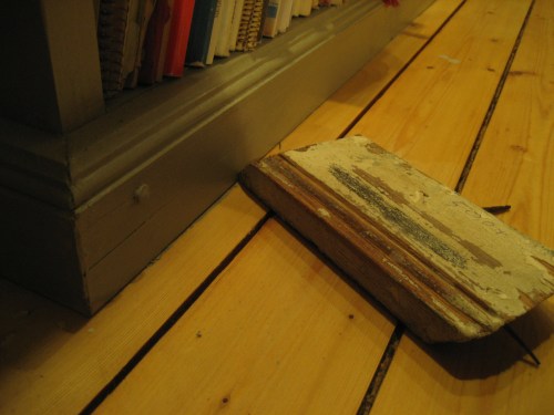 Även golvet bjöd på lite utmaningar. Längs med en utomhusvägg misstänkte jag och min far att trossbottnen hade rasat in i grunden. Detta grundade vi på vad vi såg genom grundluckorna. Så jag bröt upp tre bräder för att upptäcka att det inte var något fel utan bara ett litet hål där det sakta singlats sågspån igenom. Jippi, hål i golvet. Inget gammalt golv förvisso, från 1950-talets modernisering, men ett golv vi tänkt spara. För att ersätta bräderna fick vår trogna såg fixa fram tre granbräder i samma dimension bara för oss. Han gör allt i furu vanligen men han bangade inte på att leta fram lite gran för vår skull. Snart ska jag dra dit med krångliga franska foder och se vad han klarar.