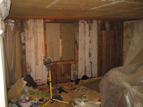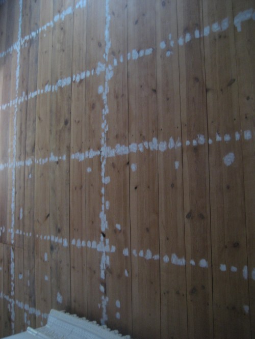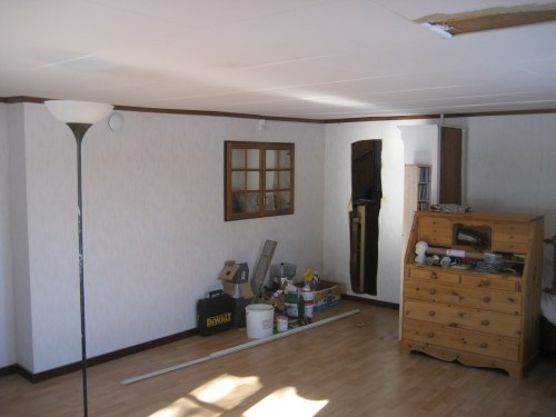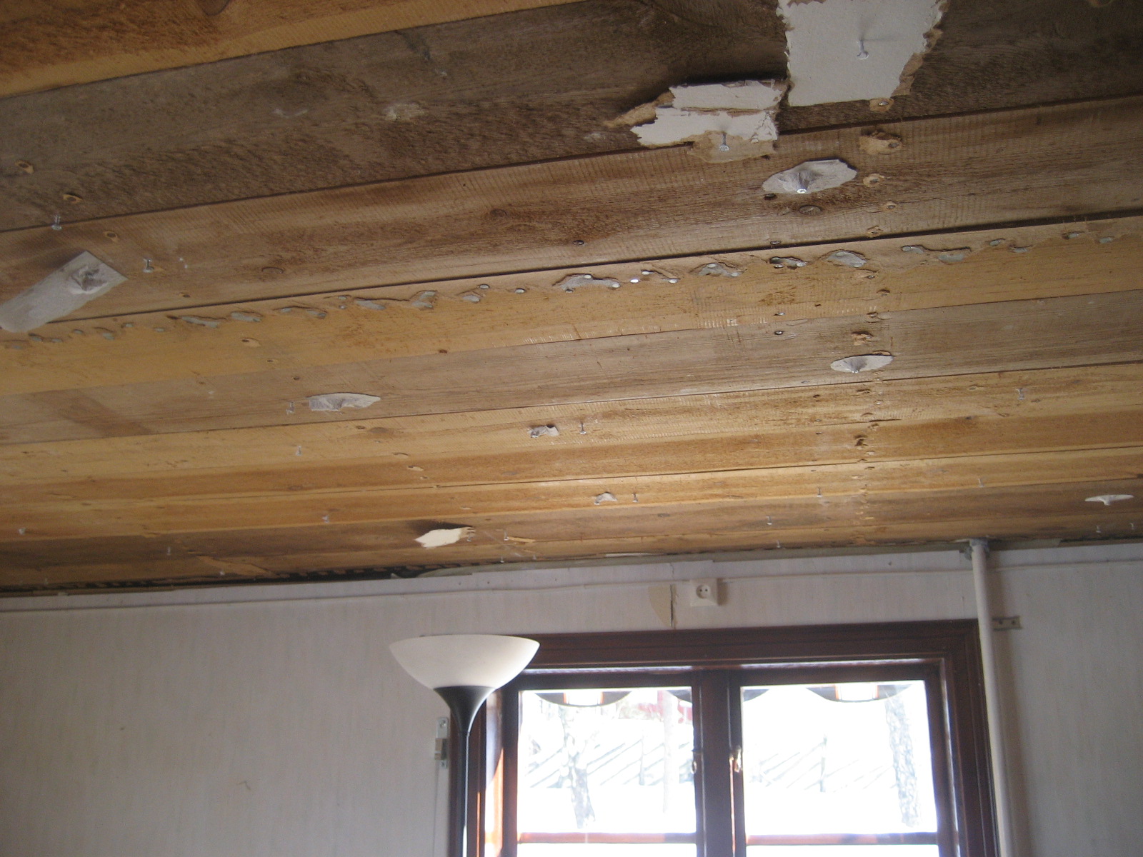 Hundratals spikar och skruva att avlägsna, de senare enkla att fixa och dessutom få. Pappspiken var hårt islagen i taket varav några lätta att få ner med hovtång men de flesta krävde några dagar idogt uttragande med ett slitet stämjärn. Ett mycket strängt arbete med bakåtkrökt rygg, sågspån i fejjan och mjölksyra i armarna. Hej hå, en burk spackel och massa hål. Mer krökt rygg.