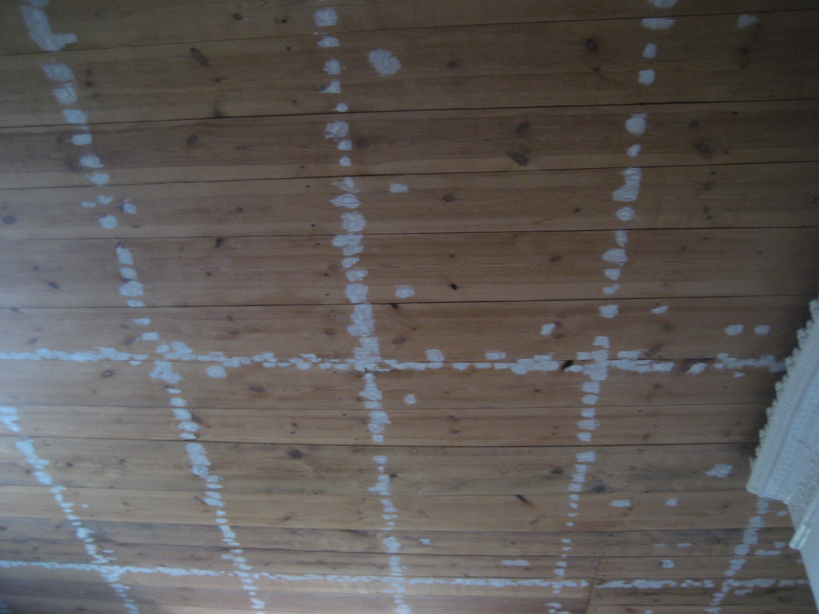 Under gipsplattorna fanns rester efter två lager spännpapp och under det ett kilsågat tak.  Brädtaket är omålat och råsågat med en grov yta vilket tyder på att taket aldrig varit framme utan tjänat som underlag för spännpapp. Vi beslutade att vi skulle trots allt använda detta tak som synligt tak då spännpapp kräver övermäktiga byggnadsvårdsskills att sätta upp.