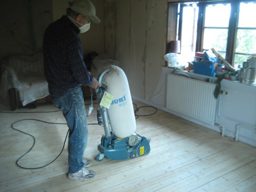 Vi gillade inte sliten lack så vi hyrde slipar och gick lös. Man ska generellt undvika golvslipning men i detta fall var det i sin ordning. Sliparna avverkar mycket material vilket kan te sig förödande på riktigt gamla golv.