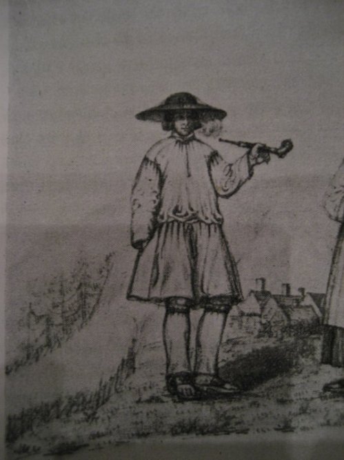 Mandelgrens teckning visar en skjorta med förhållandevis låg krage, ok över axlarna, knälängd, sprund i halsen och enkla ärmslut. Det är troligt att mannen som avbildas är klädd för arbete en varm dag då hans knäskålar och nakna fötter i de karaktäristiska vångaträtofflorna syns. Det kan tänkas att Mandelgren avbildar en slags arbetsskjorta (likt en bussarong) men det är tydligt att de speciella elementen i Wiedes uppteckning stämmer överens med Mandelgrens teckning. Mer problematiskt är dock att Mandelgren avbildar även en bergsbonde i Vånga som tydligt bär hög krage.