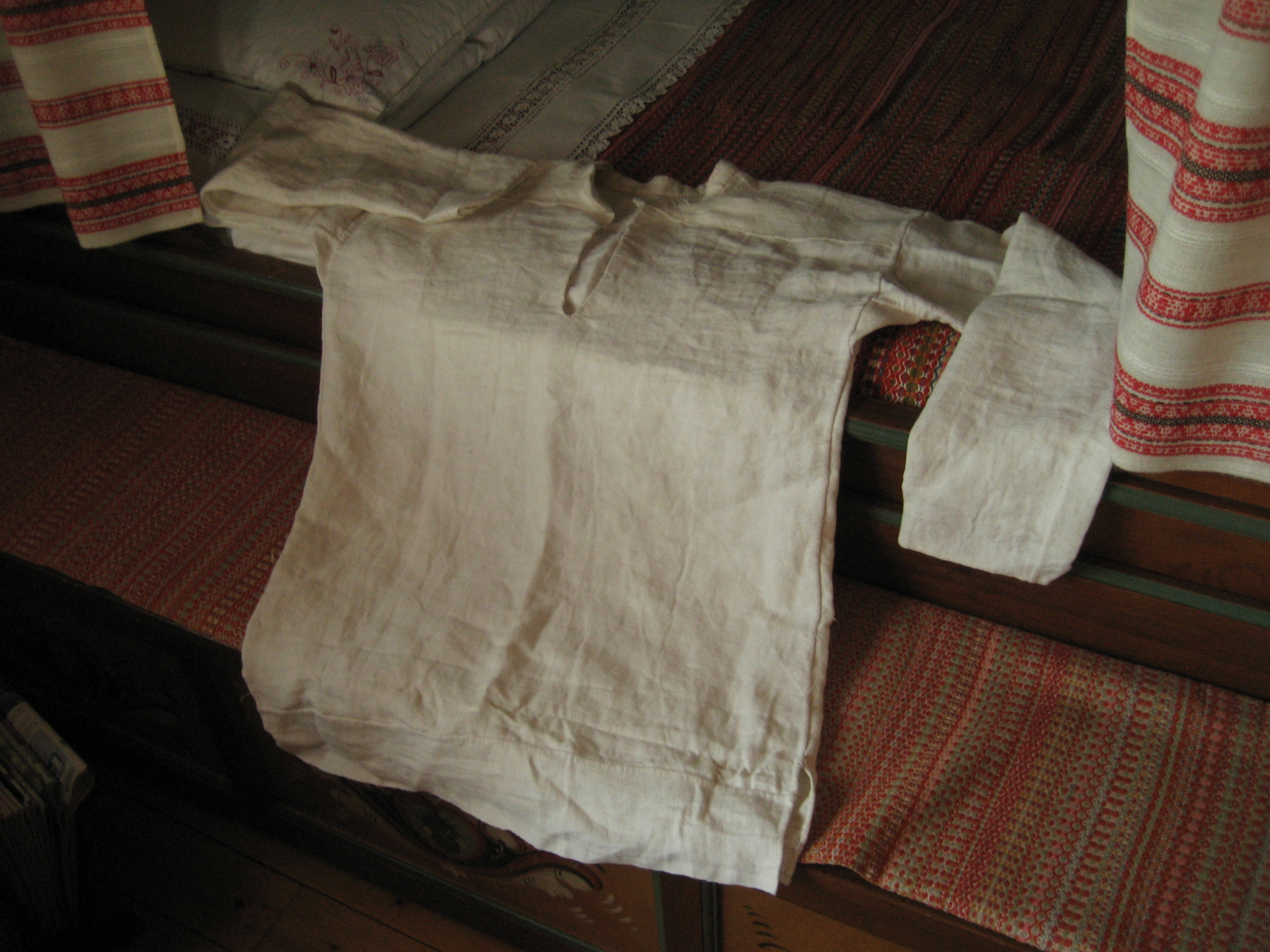 Jag har valt att främst gå på uppteckningens linje med låg krage och en liten enkel fåll längst ner på ärmen. Som tillägg har jag enligt Mandelgrens illustration lagt till ett ok som kan skönjas på bilden. Ärmhålorna har små ärmspjäll och ganska stor sprund som börjar där oket slutar, som på bilden. Nedtill har jag inte följt bilden utan min är något kortare, främst på grund av materialbrist. Mandelgrens skjorta är mycket lång och det är svårt att fastställa huruvida denna skjorta har kilar i sidorna vilket är oerhört sällsynt när det kommer till mansskjortor. Särkar har vanligen kilar. Jag försökte få ut några ynka cm nedtill genom att skarva av överblivet material. Jag har slitsar vilket är kutym på mansskjortor.