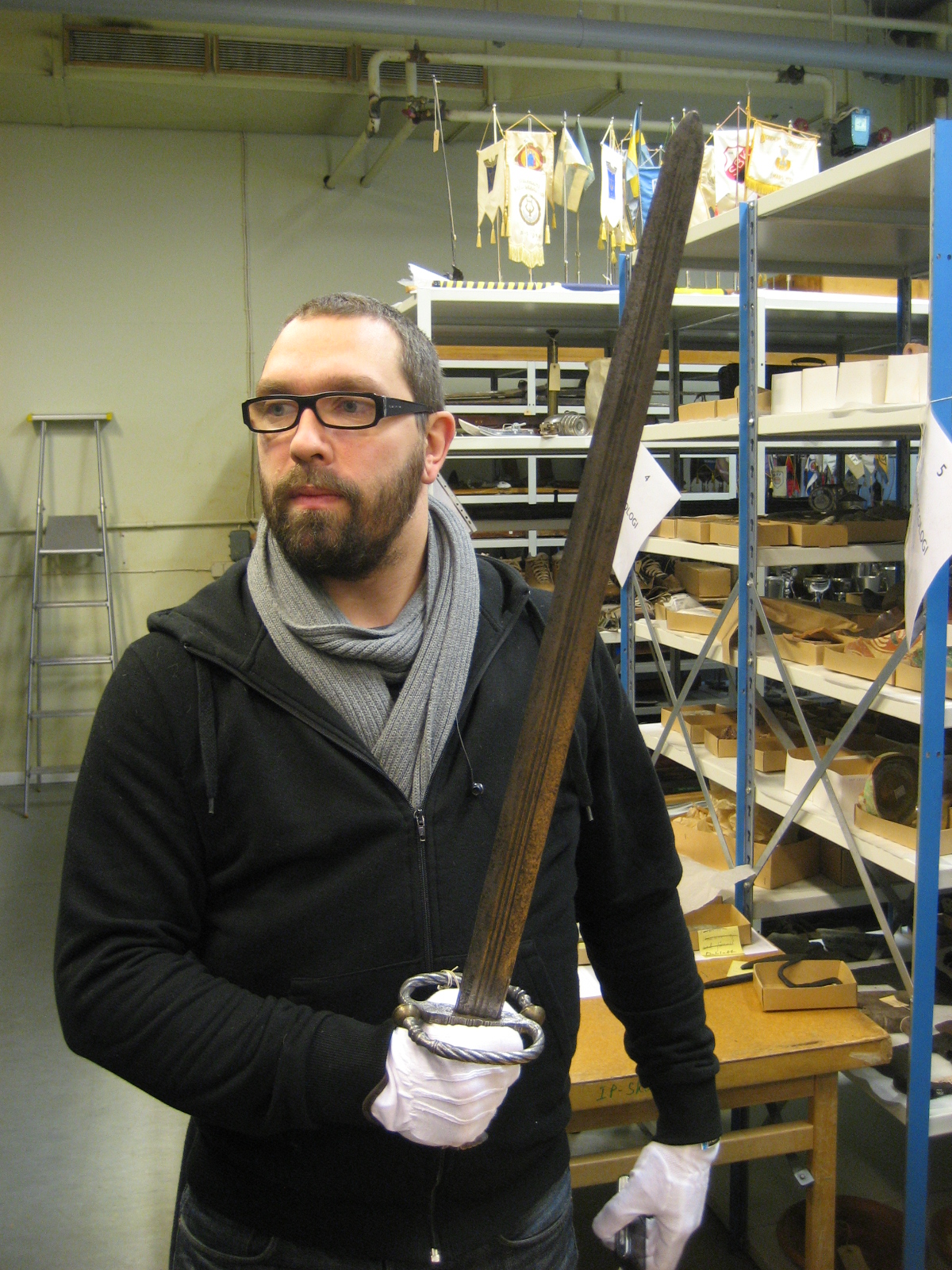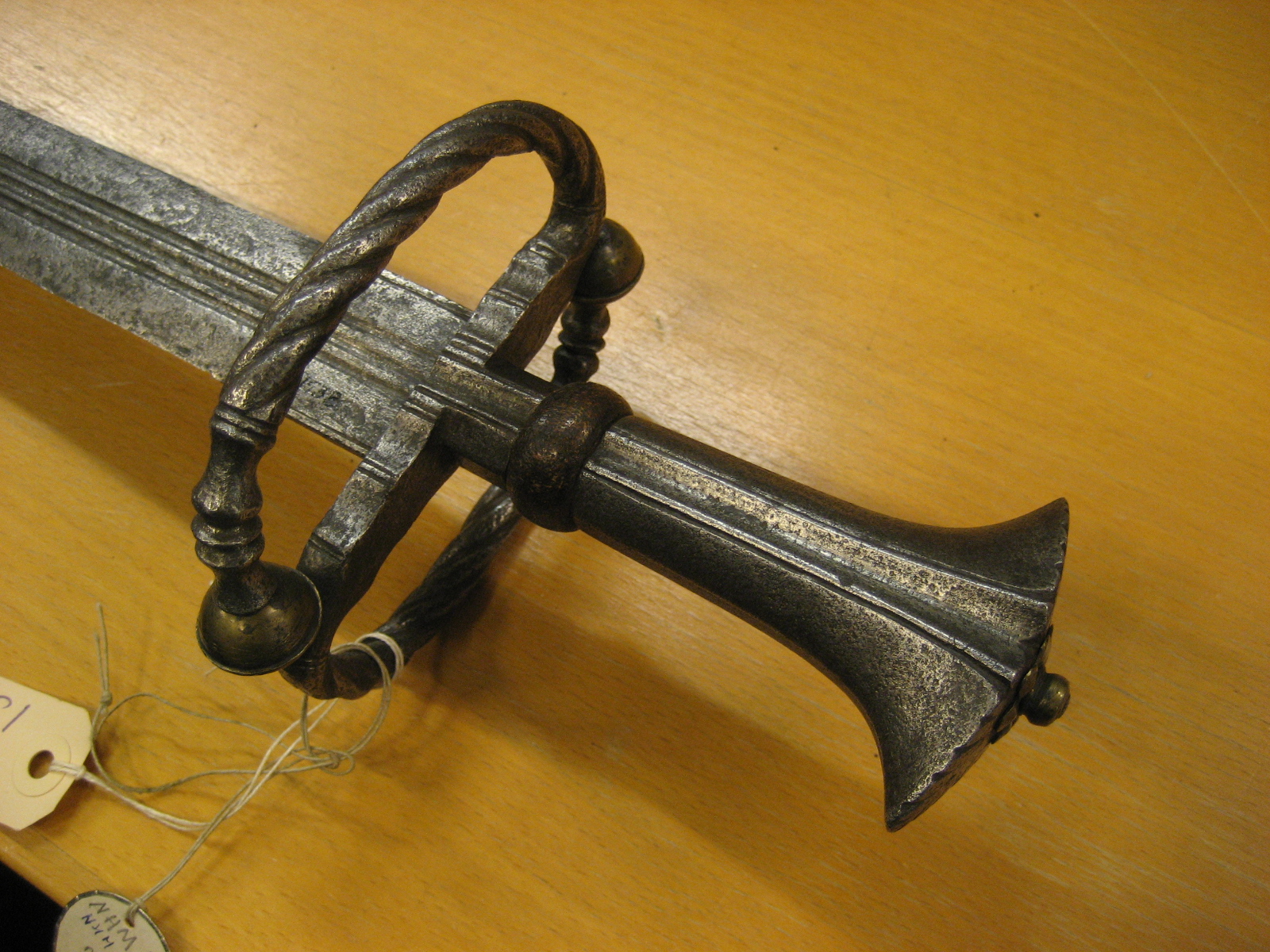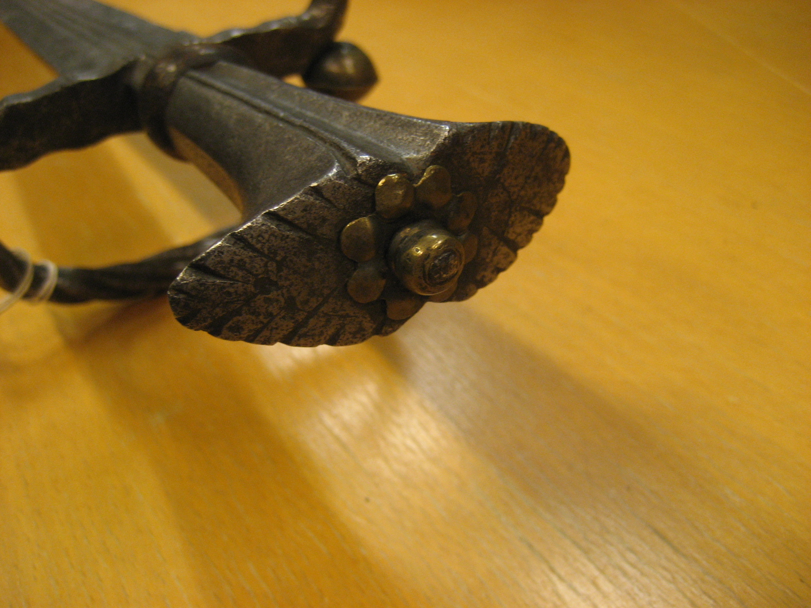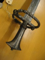 Den gamla landsknekten (och järnåldersmannen) Johnny hittade bland klingorna en riktigt fin Katzbalger från ca 1520 med helt metalfäste med endast en liten ring av ben runt kaveln. Balansen var superb, lätt och snabb.