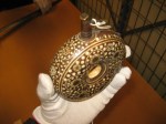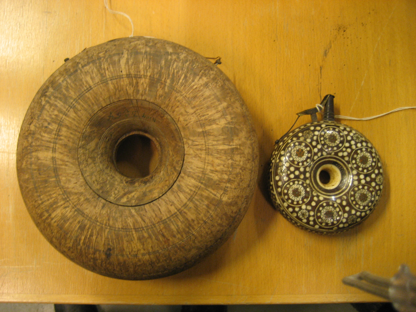 Som det ser ut är den stora krutflaskan av masur och den är ovanligt stor ska väl tilläggas. Den är troligen svensk för artilleriet som fängkrutsflaska. Den mindre är kanske tysk?