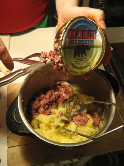 I köksregionerna utspelar det sig också ibland de mest historiska experimenten. Jag vet inte vad ni brukar få av era fruar och män i julklapp men jag fick i vilket fall en köttkonserv. Det var inte vilken som helst utan finskt björnkött. Det påminde om kattmat när vi öppnade burken men tillsammans fick vi den briljanta idén att göra lappkojs för att göra det mer attraktivt. Ni läsare får också chansen att lära er något!