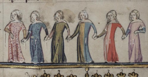 Här följer en liten kavalkad som visar på stor rikedom i såväl skärning som färg och materialval (Alexanderromanen 1340-tal blad 181v.)