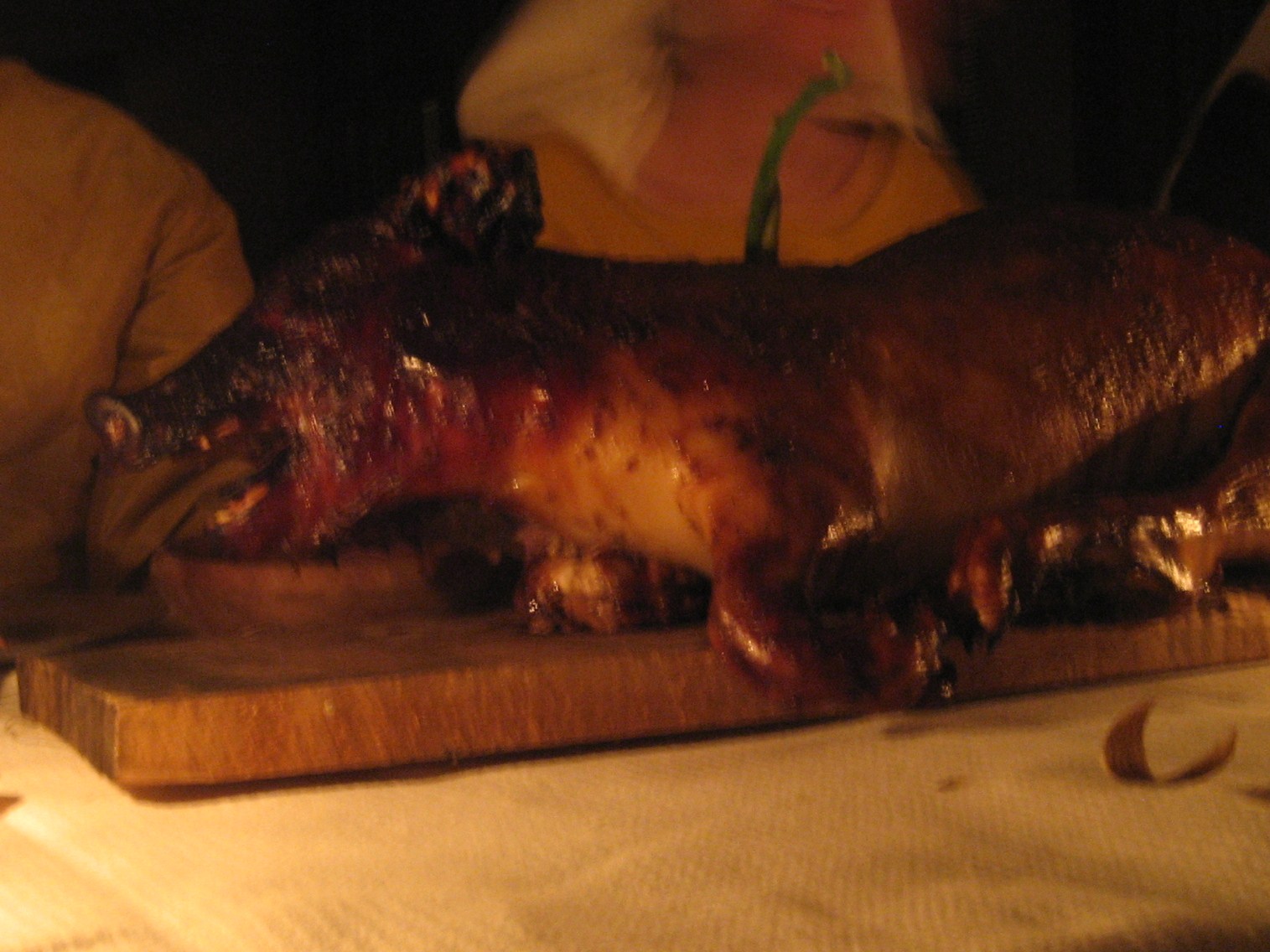 Kvällen bjöd på allsköns upptåg och maten var något speciellt. Taget rätt ur minnet kan jag minnas tre serveringar med bland annat en mustig vildsvinssoppa, rökt fisk, bröd, baconlindad fisk, köttpajer, vildsvinskorv, frumenti, örtkräm, kräftor, rotsakspytt, ett stort antal såser, våfflor, hyppocras och kanske kvällens höjdpunkt, helstekt spädgris innehållande en kyckling som i sin tur bar på en ripa med ett ägg inuti.