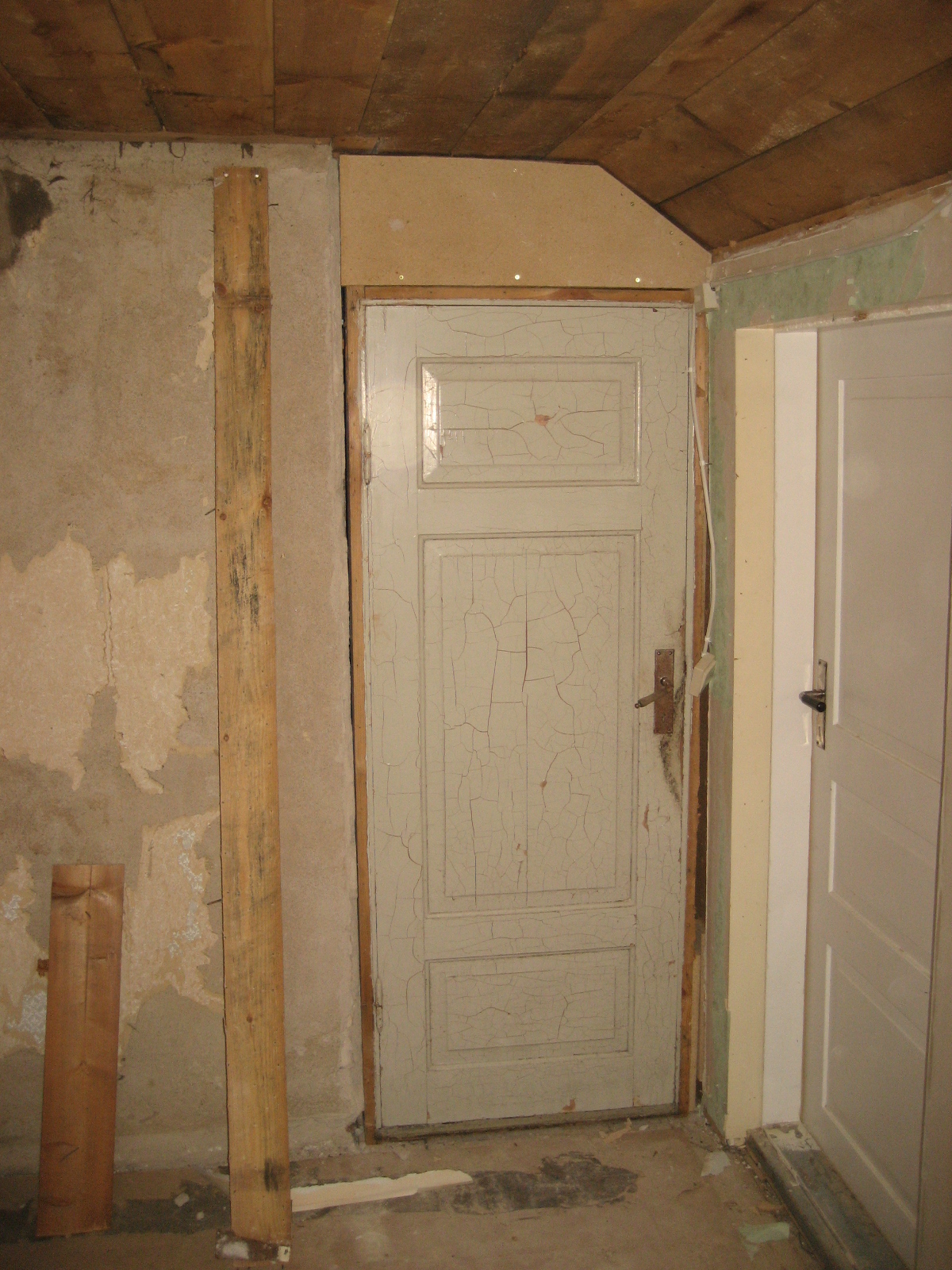 Jag rev ur karmen efter den gamla dörren och upptäckte att det fans en anledning till att den var låg. Den stod på en bärande balk. Vad göra? Att korta ner den nya dörren kändes aktuellt inte så jag löste det genom att ta cirkelsågen och kortade ner djupet på karmen och monterade karmen framför den bärande balken. Betydligt bättre.