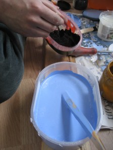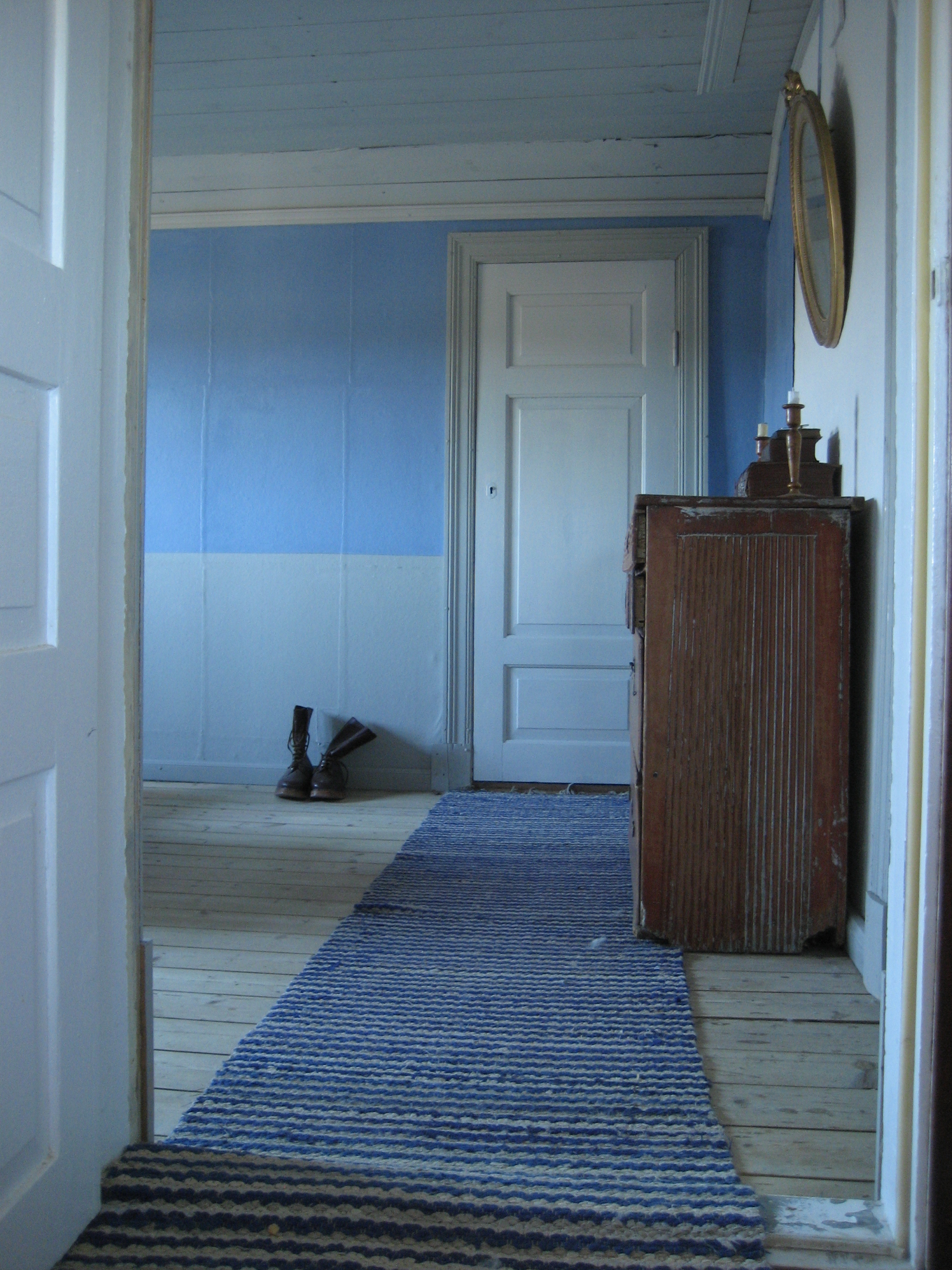 När vi öppnade den blå nyansen blev vi snabbt varse om att det inte var det vi sökte. Det var en babyblå från helvetet som i det närmaste var självlysande. För att lösa det hällde vi rätt mycket överbliven grå i den och gjorde en första strykning. Fortfarande lysande blå.  Till andra strykningen köpte vi svart pigment och mer vit. Vi lyckades matta ner färgen ordentligt med egenblandad svart linoljefärg och lite vitt. Betydligt mer harmoniskt med det grå.